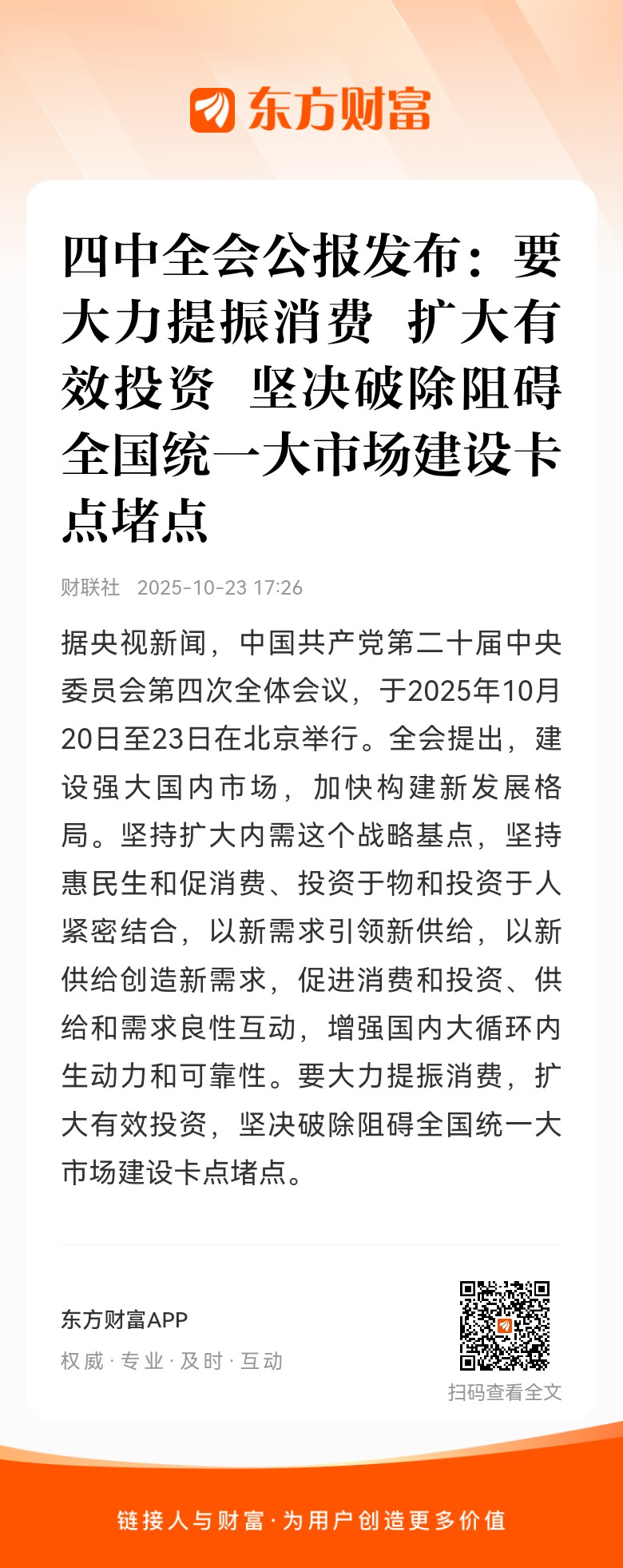 据央视新闻,中国共产党第二十届中央委员会第四次全体会议,于2025年10月20日至23日在北京举行。全会提出,建设强大国内市场,加快构建新发展格局。坚持扩大内需这个战略基点,坚持惠民生和促消费、投资于物和投资于人紧密结合,以新需求引领新供给,以新供给创造新需求,促进消费和投资、供给和需求良性互动,增强国内大循环内生动力和可靠性。要大力提振消费,扩大有效投资,坚决破除阻碍全国统一大市场建设卡点堵点。