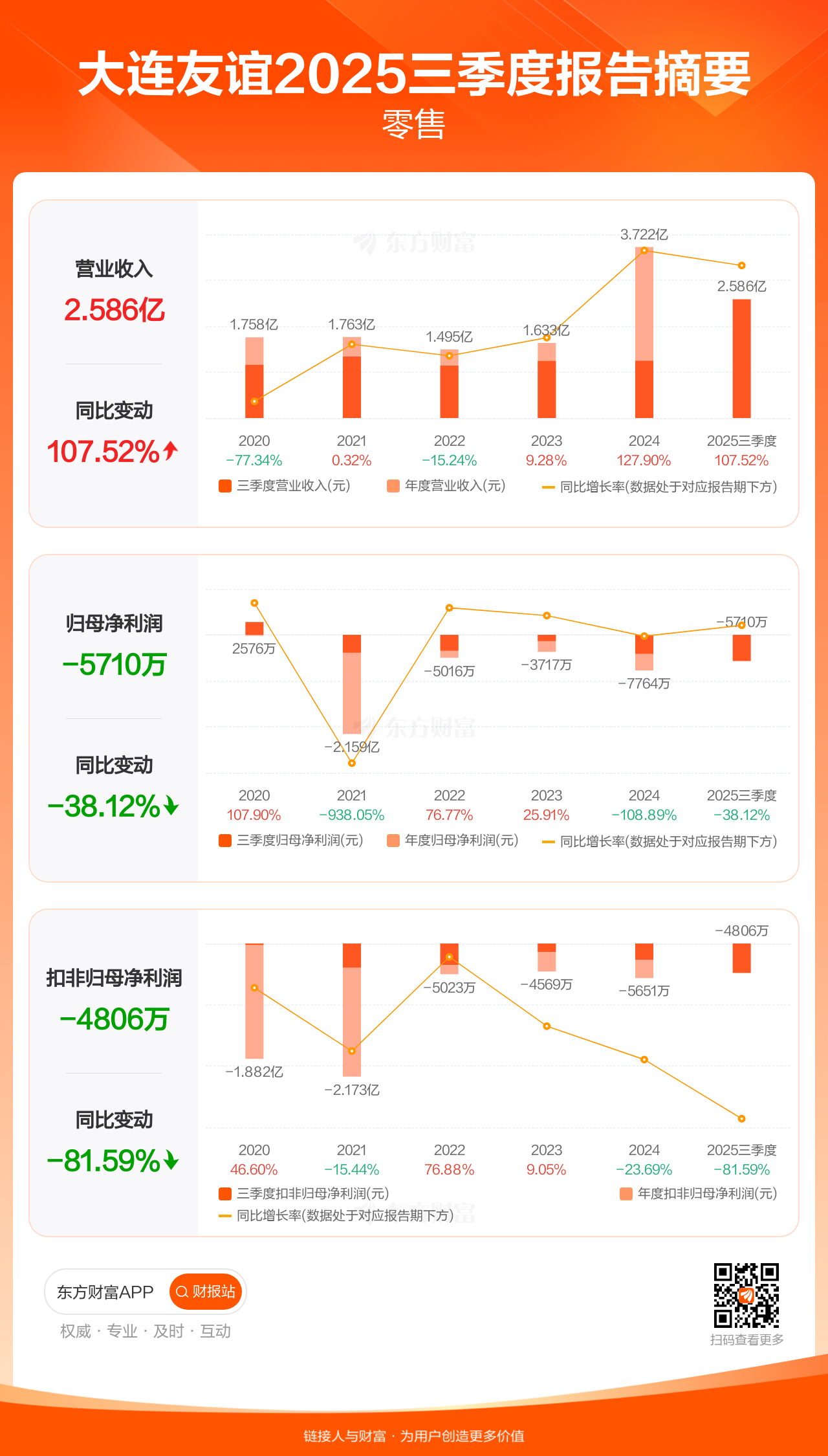 大连友谊10月31日发布2025年三季报显示,公司前三季实现营业收入2.59亿元,同比增长107.52%;归母净利润-5710.01万元;扣非归母净利润-4806.35万元。