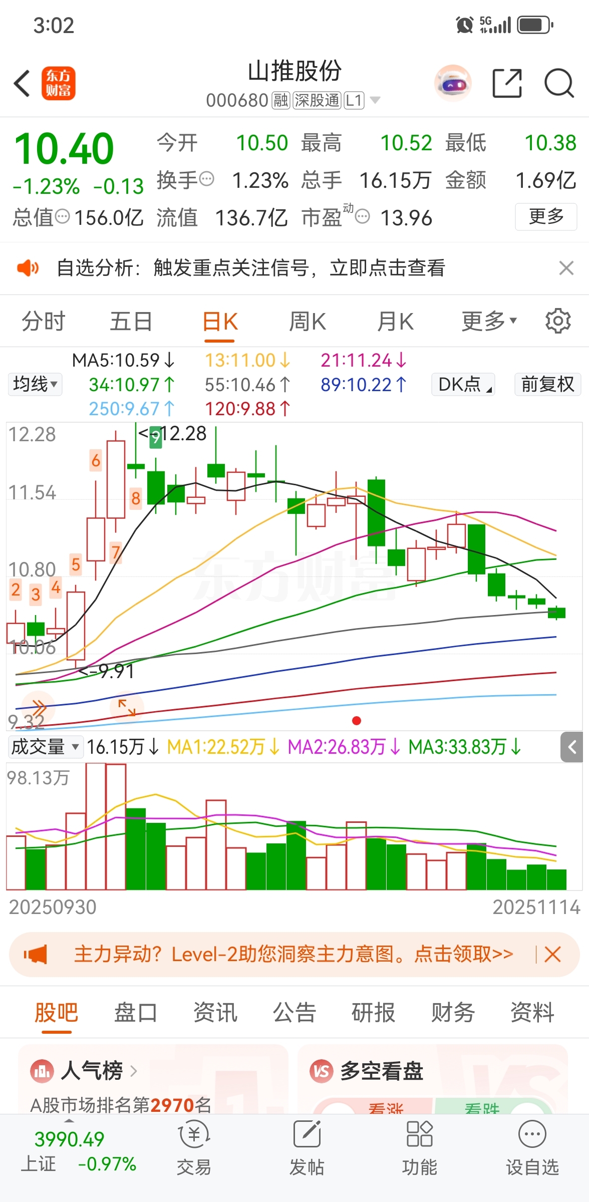 $山推股份(SZ000680)$ 虽然钝刀子割肉有些难受,但是蓝色线依然没有到,所以下周一主力会继续砸盘,只有破掉蓝色线才会出现第一个短线止跌信号。我建议主力下周一直接砸穿所有均线,彻底打破韭菜幻想,让技术流集体割肉离场才能否极泰来