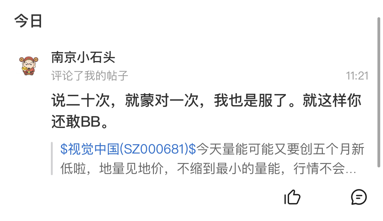 $视觉中国(SZ000681)$ 上周四看涨停之后,周五主力拉了一波,本周一周二,我一条帖子都没发,周一周二暴跌,本周三说话了,只是看好,但没说涨停,因为现在无量不涨是正常的,涨了才奇怪。我要是不看好这股了,20块钱卡你四个月甚至一年都有可能