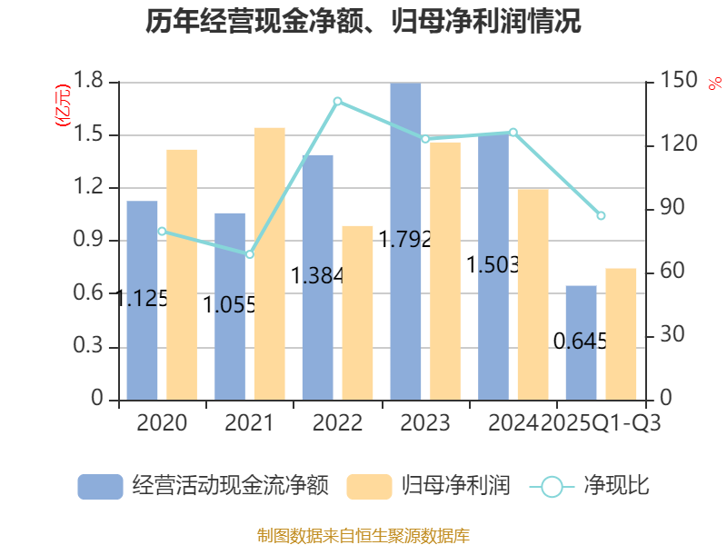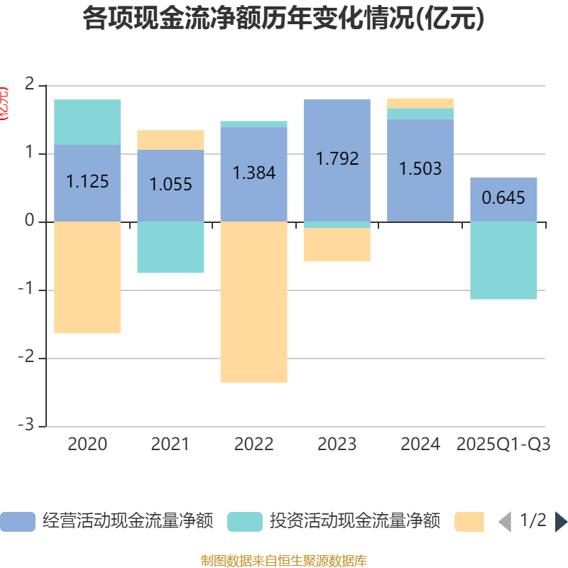 2025年前三季度,公司经营活动现金流净额为6451.84万元,同比增长1.65%;筹资活动现金流净额74.3万元,同比增加320.56万元;投资活动现金流净额-1.14亿元,上年同期为-6099.14万元。