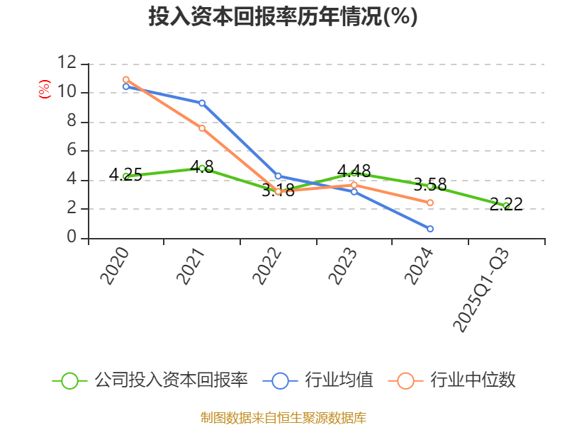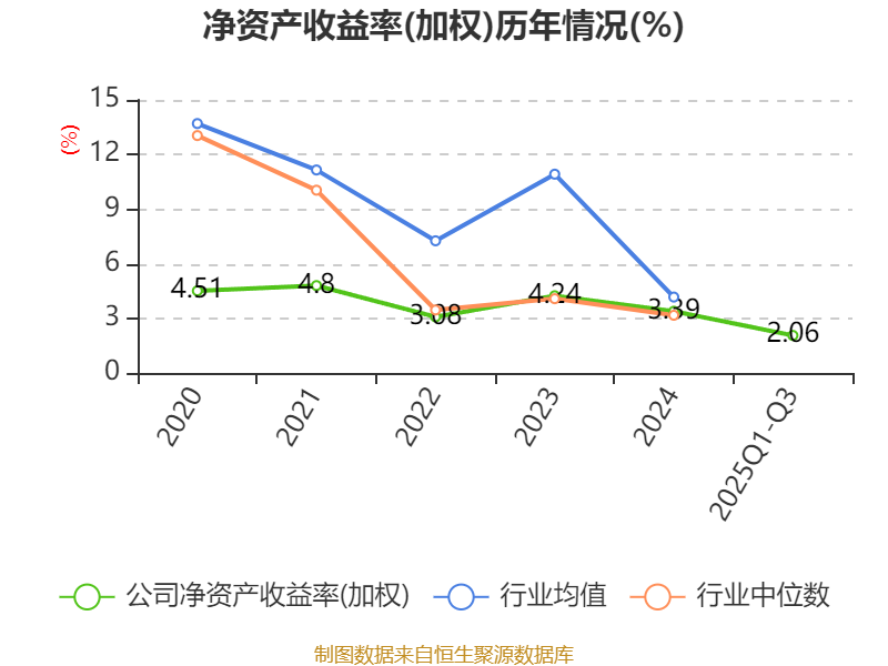 盈利能力方面, 2025年前三季度公司加权平均净资产收益率为2.06%,同比下降0.29个百分点。公司2025年前三季度投入资本回报率为2.22%,较上年同期下降0.29个百分点。