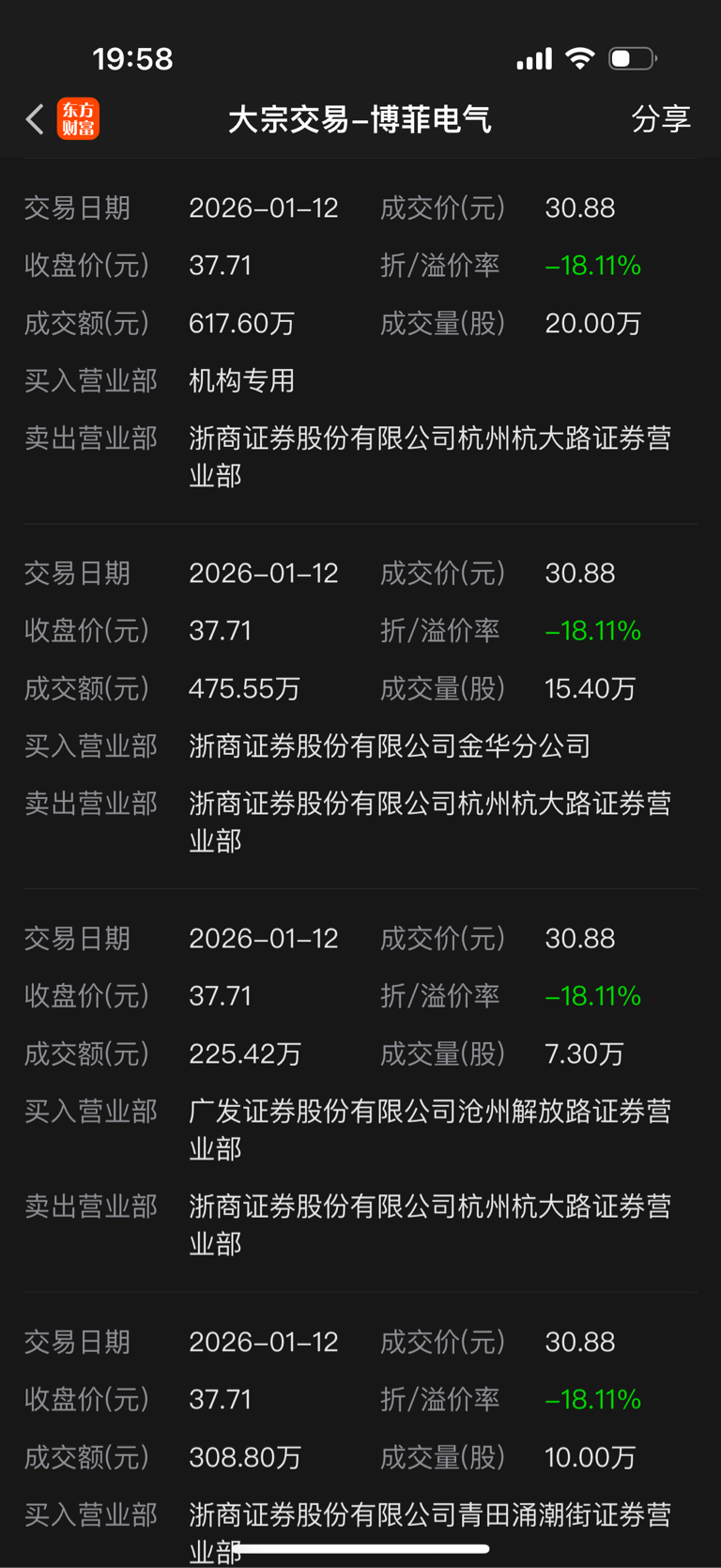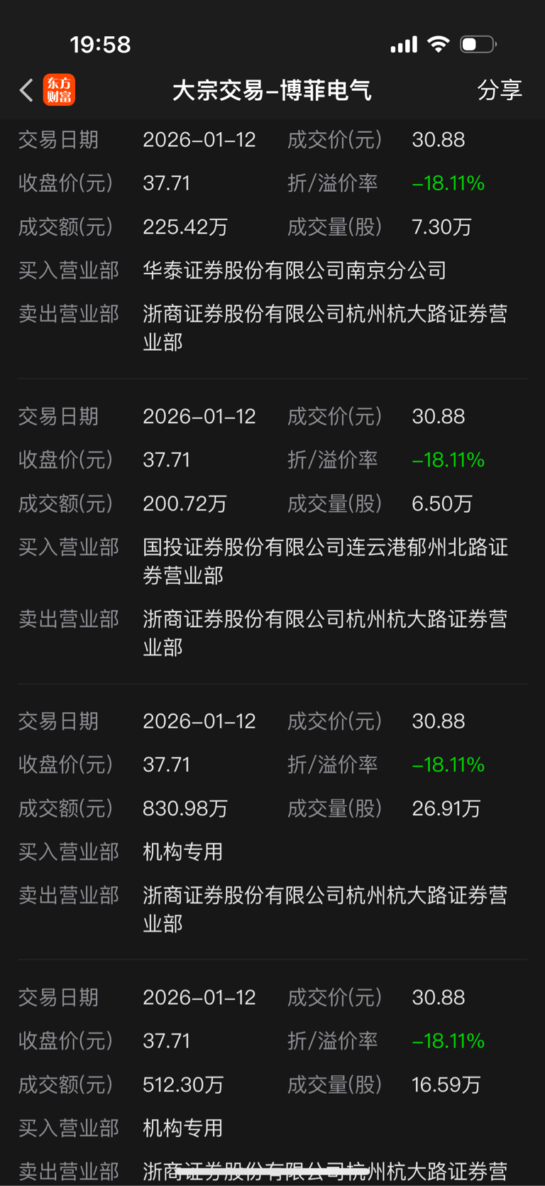 博菲电气1月12日涨停,收盘折价-18%大宗交易30.88成交。后面拉了4个涨停