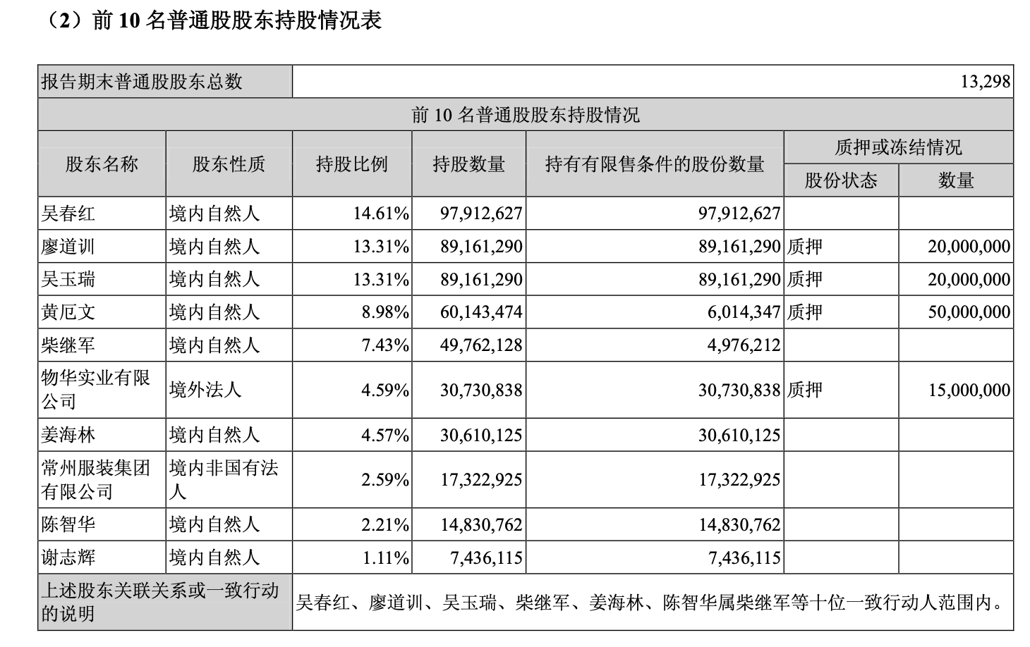 根据2014年年报数据,相关个人持股情况进一步明晰:吴春红持有9791.26万股,占总股本的14.61%;廖道训与吴玉瑞分别持有8916.13万股,各占总股本13.31%;公司现任总裁兼职工代表董事柴继军持股数量为4976.21万股,占比7.43%。