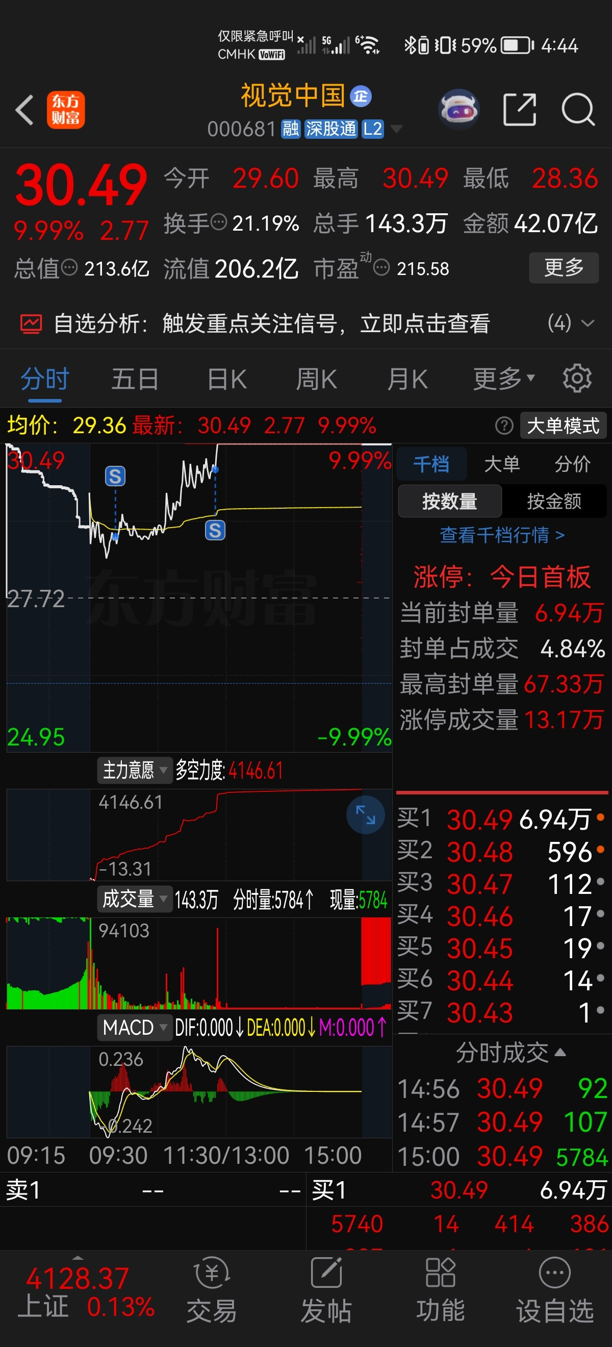 $视觉中国(SZ000681)$ 出了一半,没想到居然封板了,今天板块走一致,明天要分歧了,毕竟是后排,所以出了一半,龙虎榜开源西大街量化打板,感觉不妙。