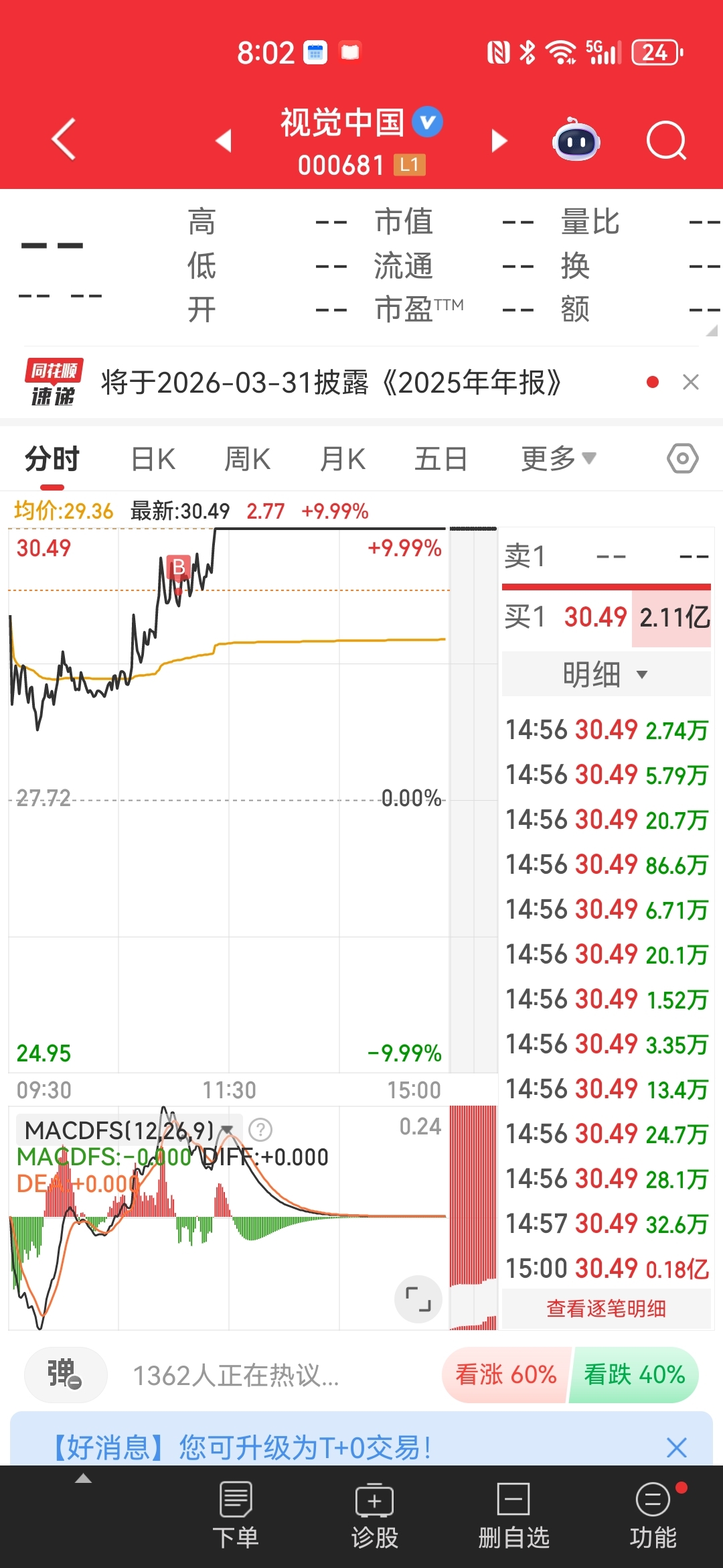 $视觉中国(SZ000681)$ 昨天打个底仓,今天继续加仓。