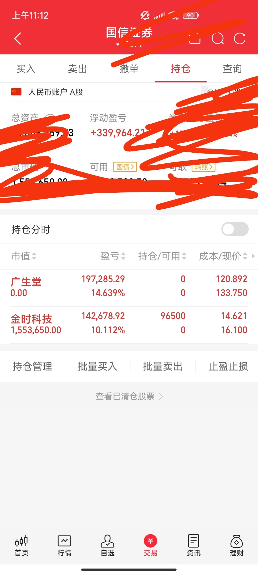 $视觉中国(SZ000681)$ 大家好,更新一下今日持仓。将广生堂止盈出局,落袋14cm。新进了金时科技,今天趋势不错,继续加油!能否在吃口大肉$欢瑞世纪(SZ000892)$