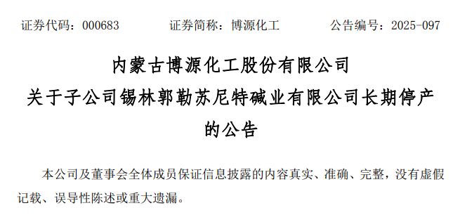12月29日晚间,老牌化工企业博源化工(000683)发布公告称,子公司锡林郭勒苏尼特碱业有限公司(以下简称苏尼特碱业)受天然碱资源品位下降、产品价格下滑、用工数量多、装置相对老旧、大宗物资采购成本高等综合因素的影响,经营状况持续恶化,近三年连续亏损,公司决定对苏尼特碱业实施长期停产,预计计提资产减值约2.72亿元,影响2025年度归母净利润约2.22亿元。