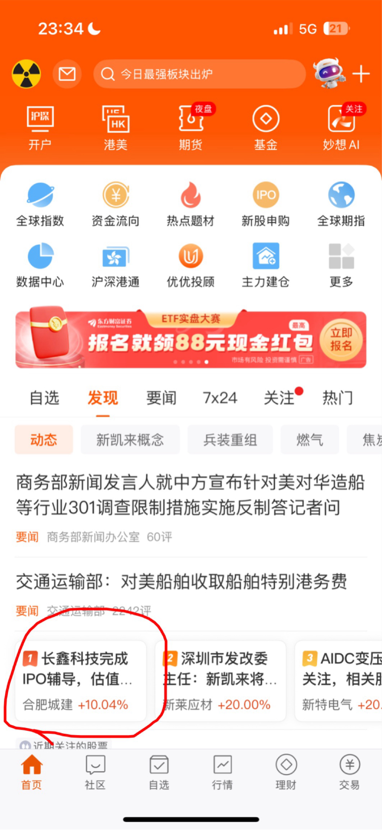 我的东财首页这个位置随时都挂着长鑫IPO的消息,你们的是不是这样?沐曦下周上会,要是同时叠加长鑫,是不是有点浪费了。感觉应该先炒沐曦,沐曦差不多了之后再炒长鑫。现在两个利好叠加,又是中山市大幅上调水价,感觉很浪费利好啊。