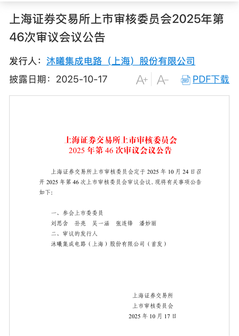 上海证券交易所公告显示,上市审核委员会定于10月24日审议沐曦集成电路(上海)股