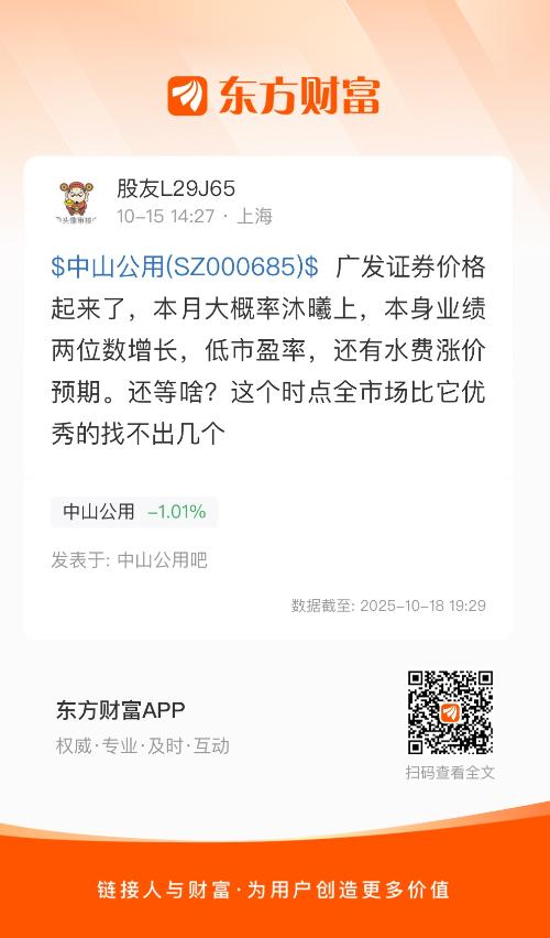 $中山公用(SZ000685)$ 广发证券价格起来了,本月大概率沐曦上,本身业绩两位数增长,低市盈率,还有水费涨价预期。还等啥?这个时点全市场比它优秀的找不出几个