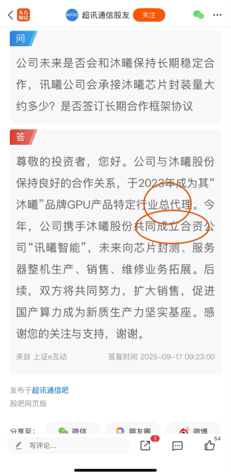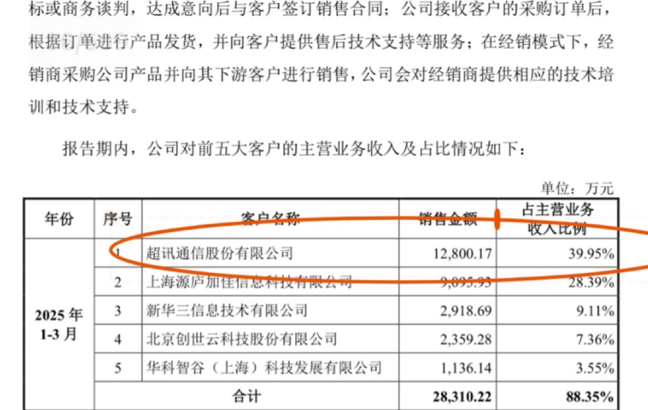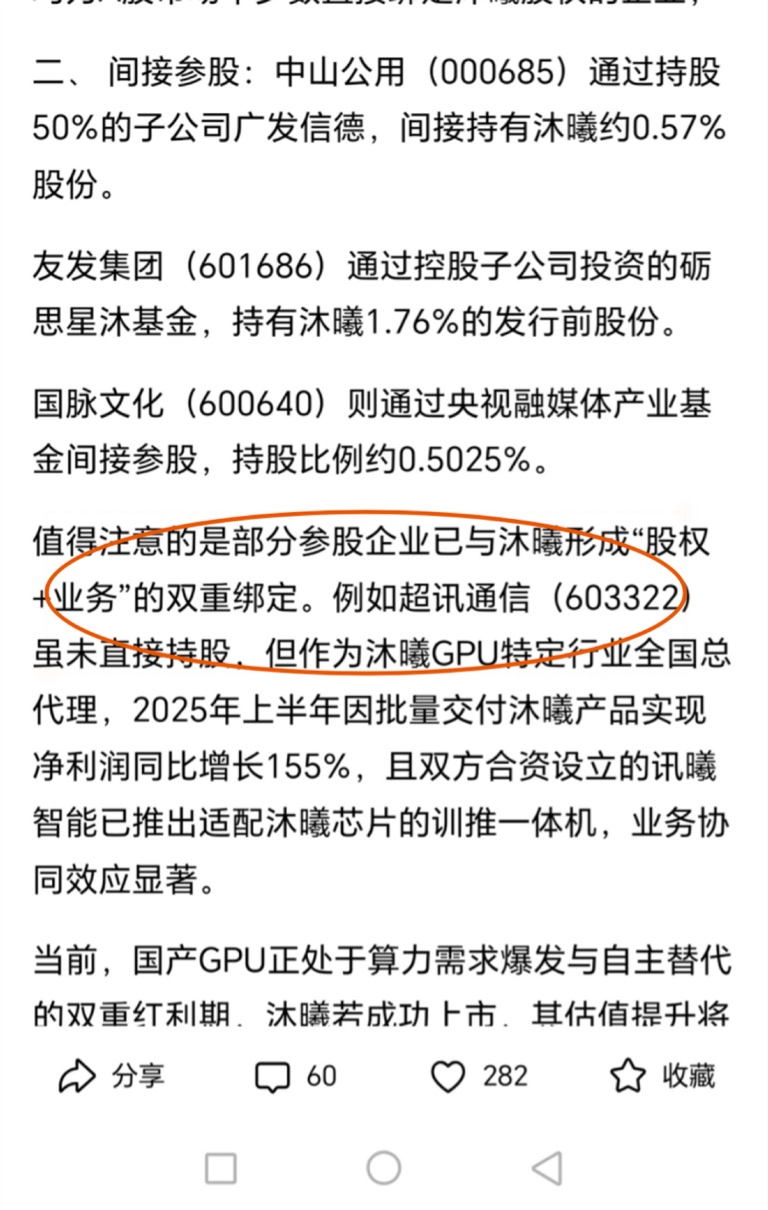 10月17号已经更新!可以去官网查看,客户与收入贡献沐曦的招股说明书显示,2025年1-3 月为沐曦贡献约 1.28亿元收入,占沐曦总收入的39.95%。并且超讯通信和沐曦集成合资公司,招股书写着超讯通信持股56%,发行持股人18%字都写得清清楚的。超讯通信跟沐曦集成是深度捆绑的!18年就开始合作至今,说明了超讯通讯的技术实力!不只是沐曦芯片总代理那么简单,超讯利用其在通信、算力平台的渠道和服务能力,将沐曦的国产 GPU 方案推向三大运营商、东数西算算力节点等重点客户,提供本地化部署的 DeepSeek-R1/V3 全栈解决方案。讯曦智能将承接芯片封测、服务器整机生产、销售、维修在内的多项核心业务,沐曦集成和超讯通信的合作始于2018年第三季度。当时双方签署了战略合作协议,为后续的AI算力业务奠定了基础。2023年11月,超讯通信与沐曦签订《行业总代理商合作协议》,成为沐曦GPU产品的特定行业总代理商。在芯片封测、服务器整机生产、销售和维修等环节开展深度合作。超讯都跟沐曦已经合资开了公司说明,也是沐曦集成的芯片总代理,我觉得就不再需要另外小份额的间接投资了!这足以说明双方都是关系紧密,深度捆绑的,未来将会为国产品牌创造更广阔市场空间!