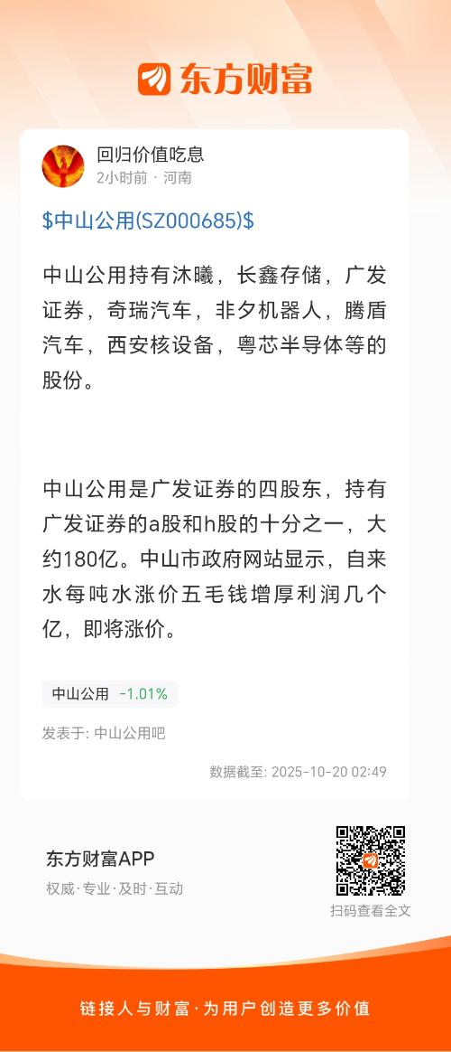 中山公用是广发证券的四股东,持有广发证券的a股和h股的十分之一,大约180亿。中山市政府网站显示,自来水每吨水涨价五毛钱增厚利润几个亿,即将涨价。