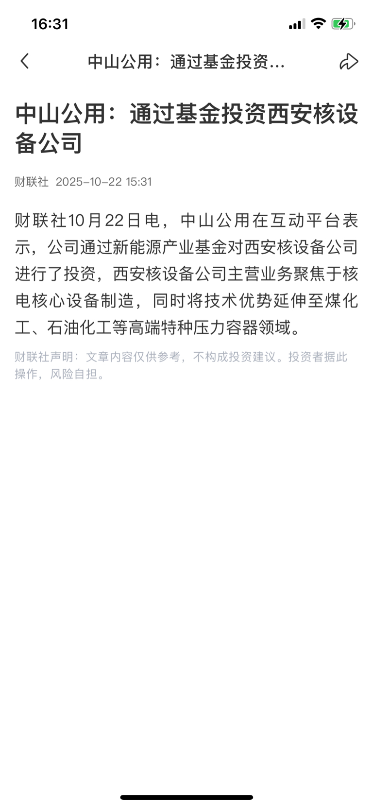 虽然中山投资了哪些项目,相信一直坚守的股友都做了功课。但财联社发的,力度就不一样,14.39发的有可能被量化检索到直接拉升,盘后又发了投资核设备公司,明天看看市场反馈。