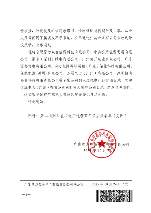 近日,广东电力交易中心有限责任公司正式发布《第二批列入虚拟电厂运营商目录企业名单