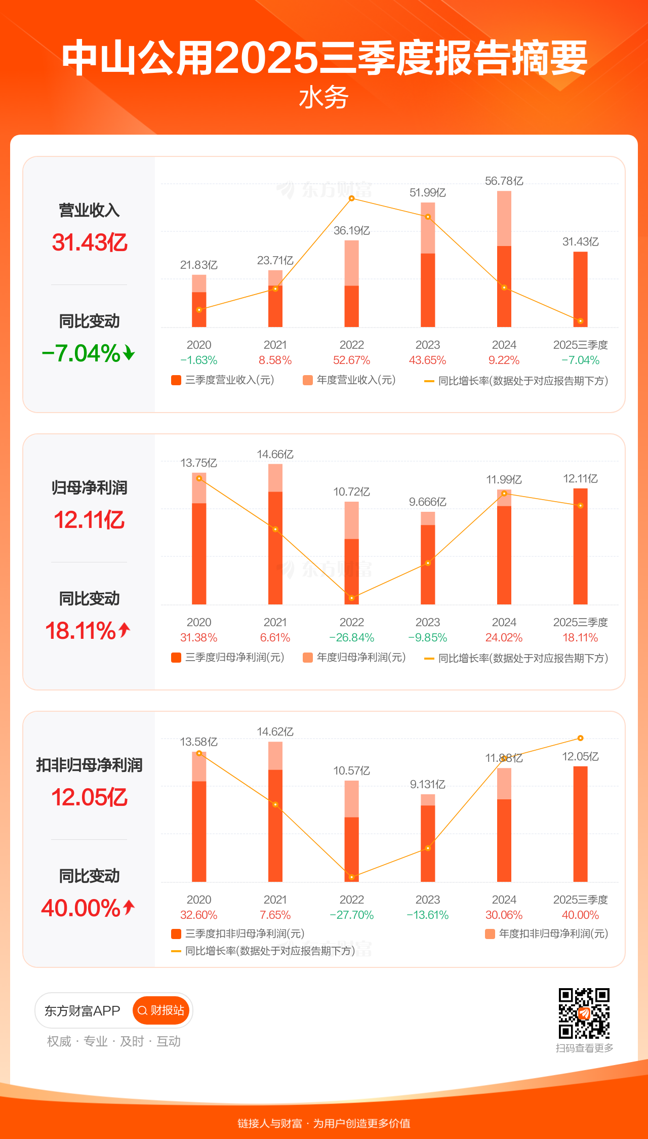 中山公用10月31日发布2025年三季报显示,公司前三季实现营业收入31.43亿元,同比下滑7.04%;归母净利润12.11亿元,同比增长18.11%;扣非归母净利润12.05亿元,同比增长40.00%。