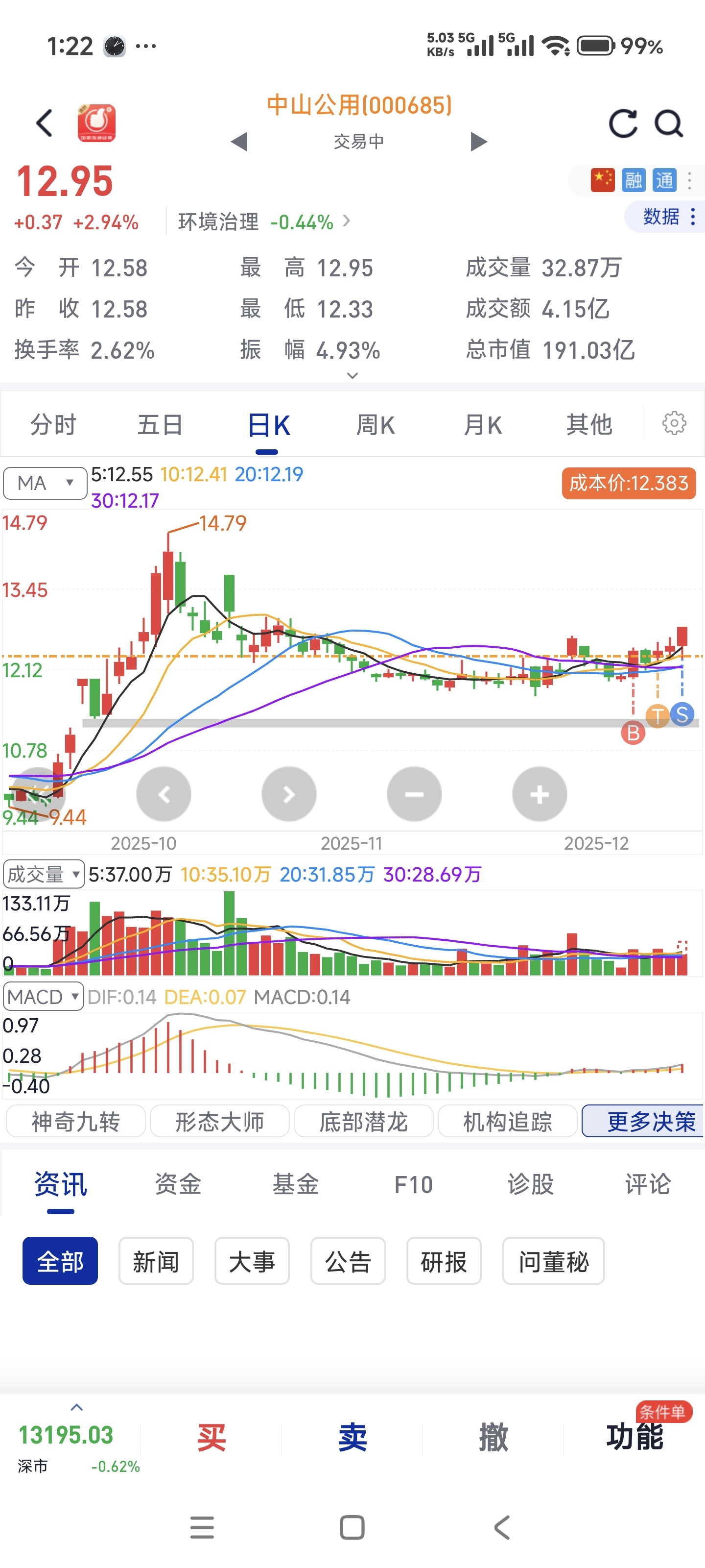 $中山公用(SZ000685)$ 12.93已清仓,下来再进。