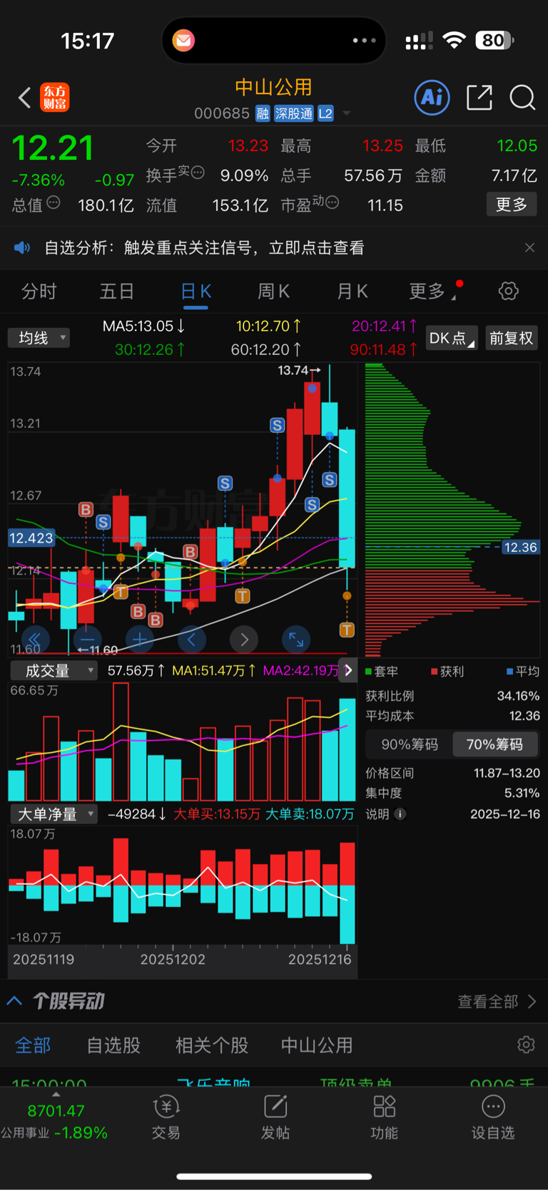 $中山公用(SZ000685)$ 节奏没把握太好、幸亏没贪还有利润垫、目前这根大阴线要磨时间了只敢留底仓观望了