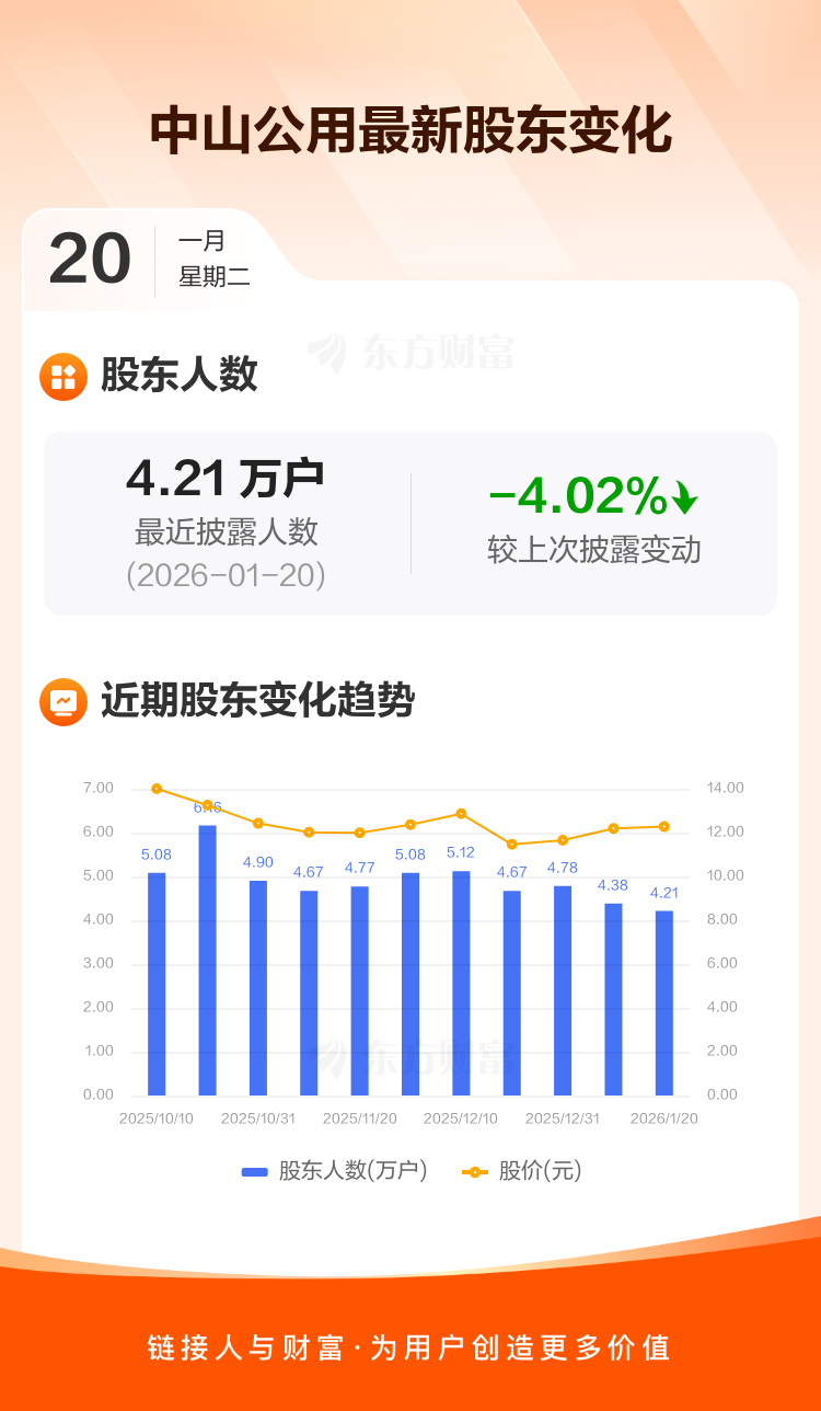 中山公用:截至1月20日最新股东户数4.21万户,较上期减少4.02%