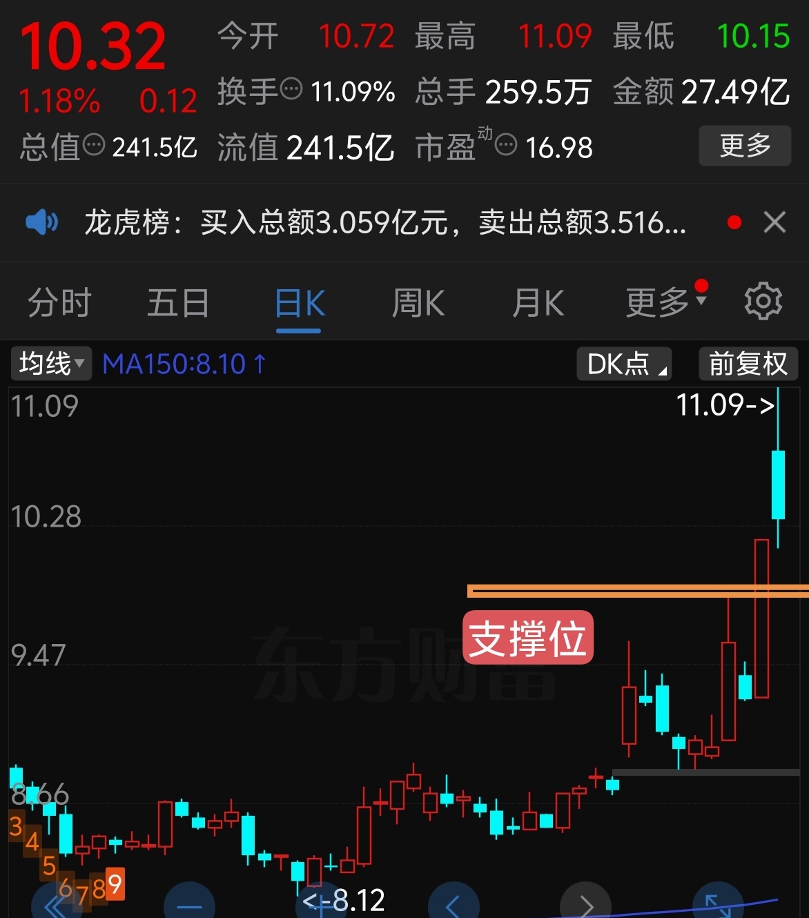 今日股价收于10.32元,日内冲高回落放出天量收长上影线,显示11元上方抛压较重