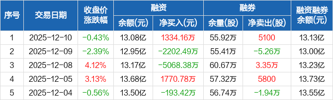 东北证券:融资净买入1334.16万元,融资余额13.08亿元(12-10)