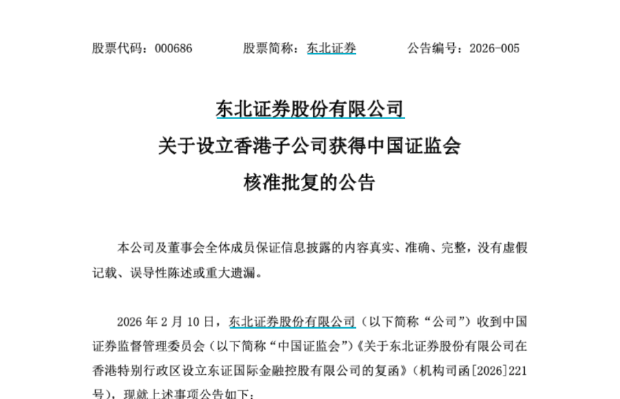 2月10日晚间,东北证券公告称,其设立香港子公司东证国际的申请,已获得中国证监会核准批复。