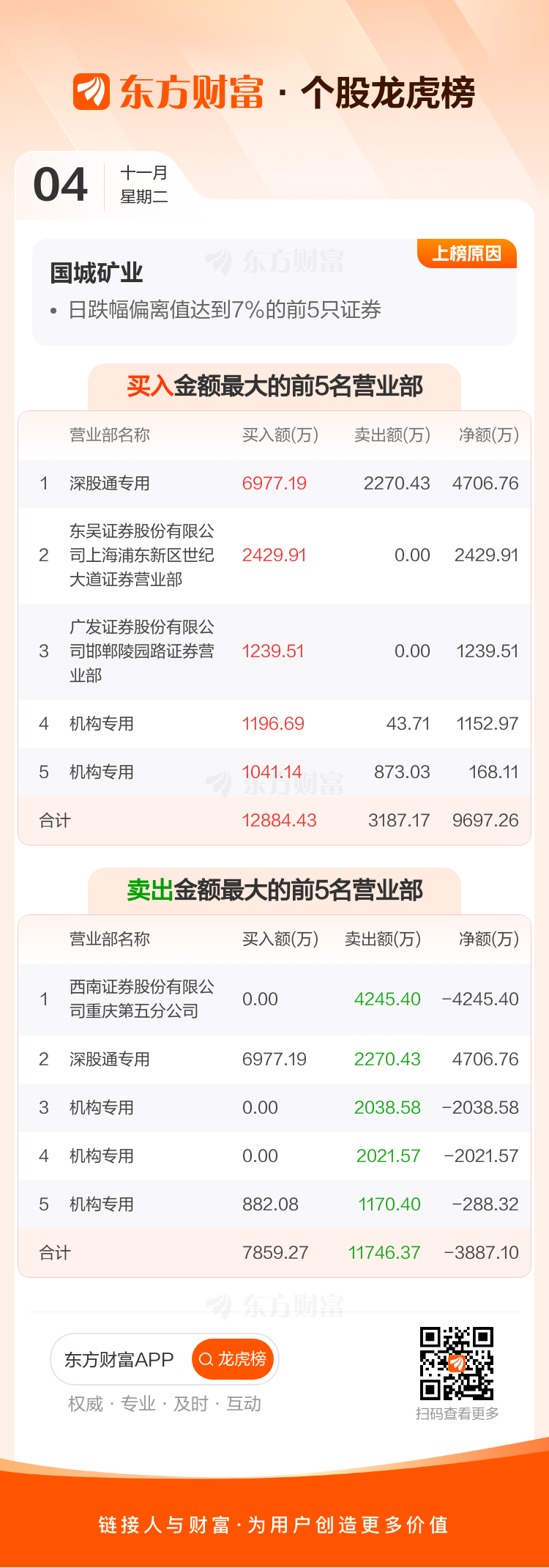 交易所2025年11月4日公布的交易公开信息显示,国城矿业因成为日跌幅偏离值达到7%的前5只证券上榜。国城矿业当日收报16.45元,涨跌幅-10.01%,偏离值-8.66%,换手率2.71%,成交额5.19亿。