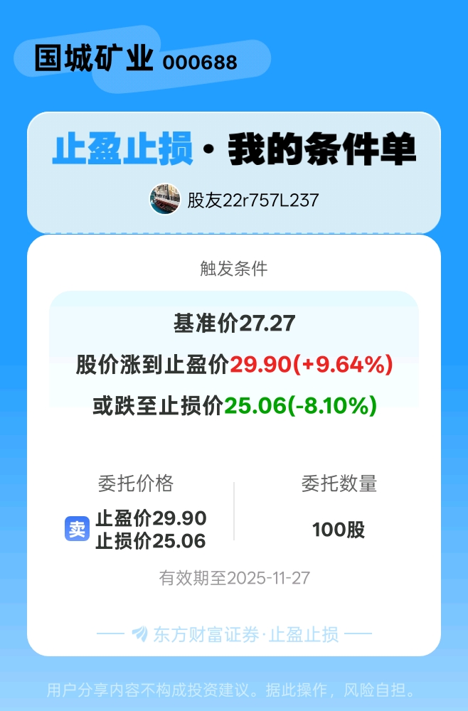 #条件单交流# #止盈止损晒单# 一位股神设置了一个止盈止损条件单,接下来就是见证奇迹的时刻~$国城矿业(SZ000688)$