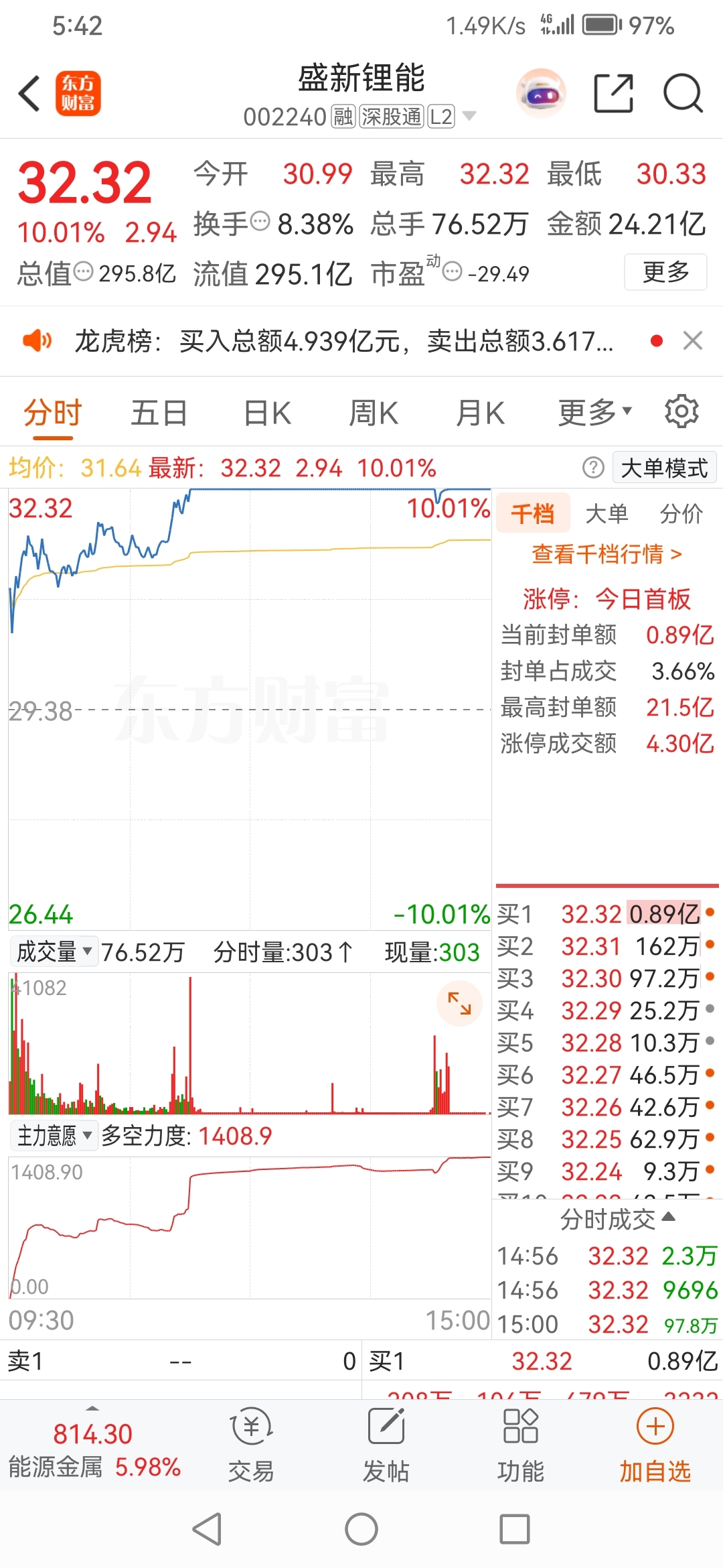 同样是锂矿概念的盛新锂能因为在14:33分开板了,所以国城矿业也在尾盘开板了。它