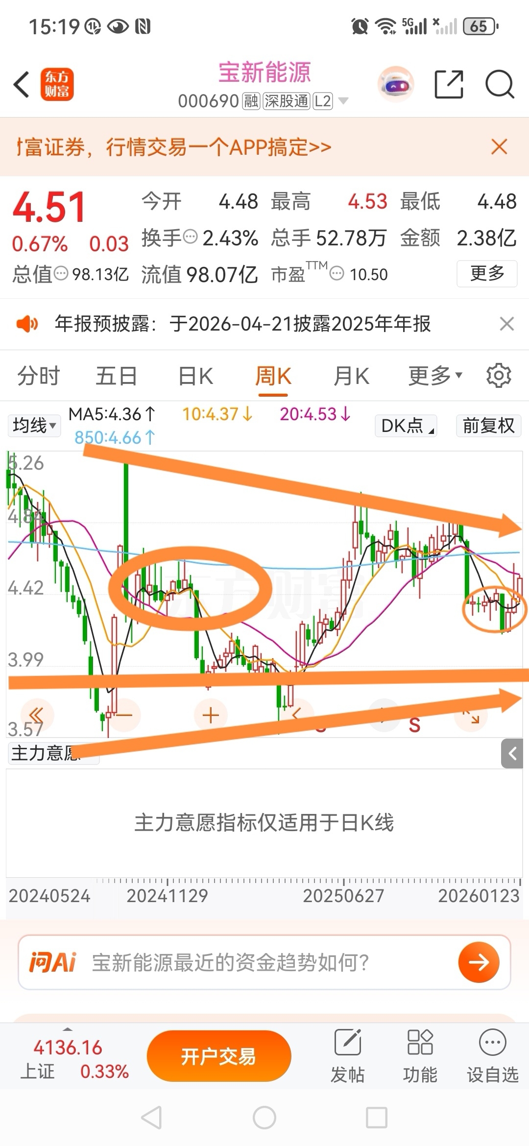 $宝新能源(SZ000690)$ 大形态从月线看2015年高低点画线是下跌趋势,如果不是这轮牛市,新低大概率可能发生。目前看小形态也是下跌趋势,三角形整理,这里已经盘整了九个交易日,久盘必跌,周一向下大概率,不知道要震荡多久,四元做个底部形态有望开启一波上涨。