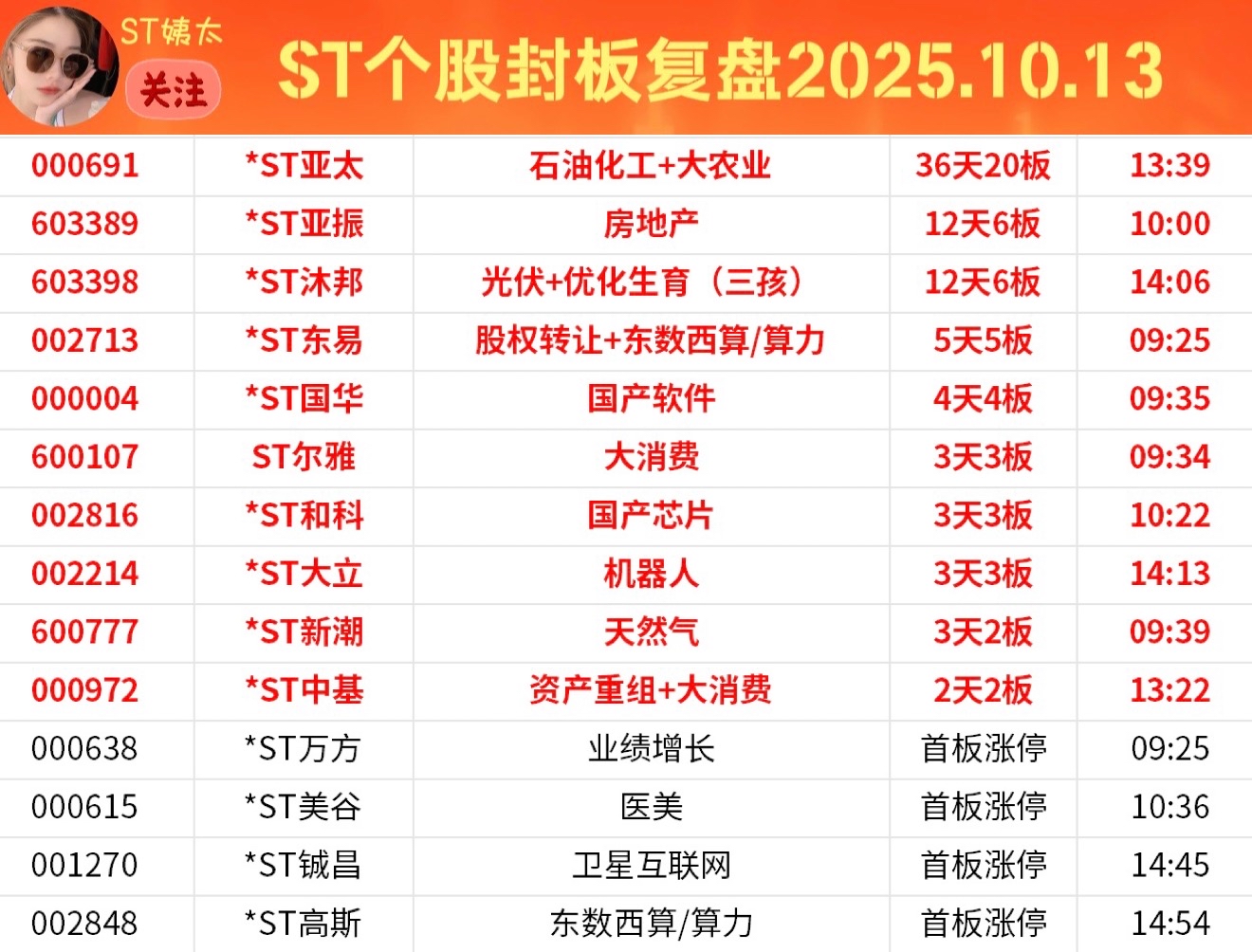 ST个股封板追踪:榜首*ST亚太