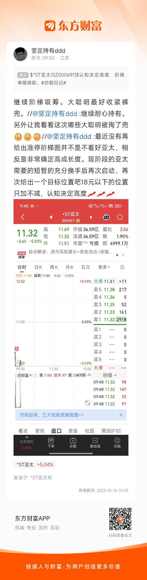 //@坚定持有ddd :最近没有再给出涨停阶梯图并不是不看好亚太,相反是非常确定高成长度。现阶段的亚太需要的短暂的充分换手后再次启动,再次给出一个目标位置吧18元以下的位置只加不减,认知决定高度