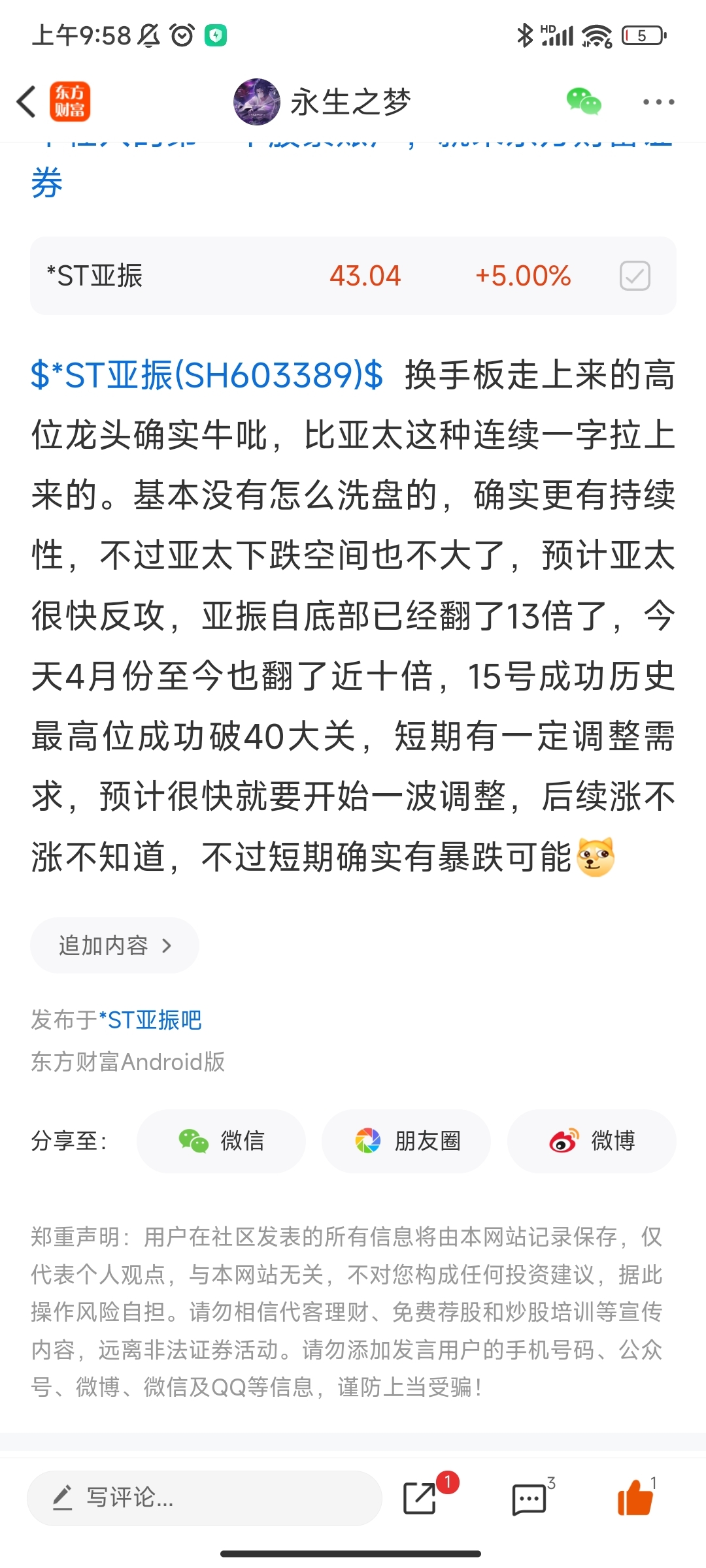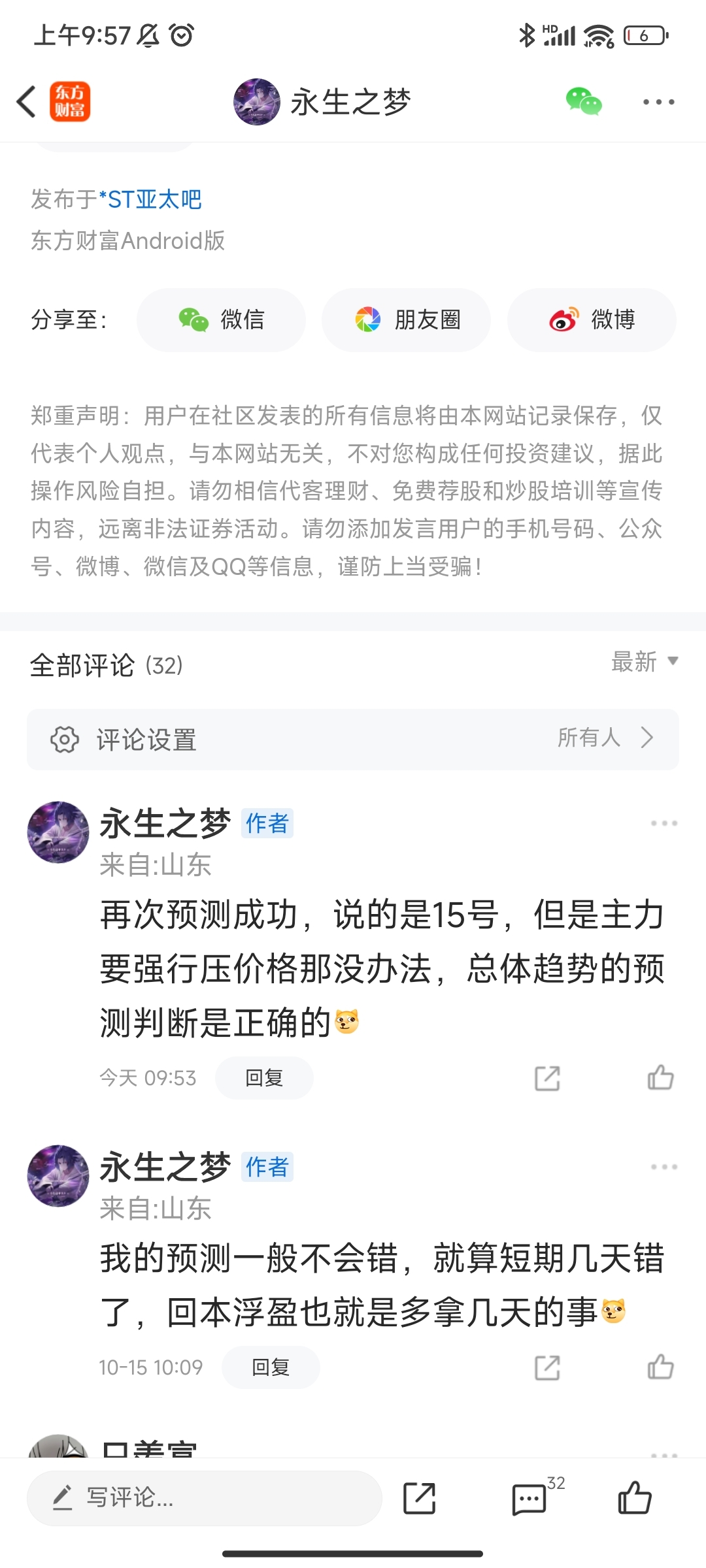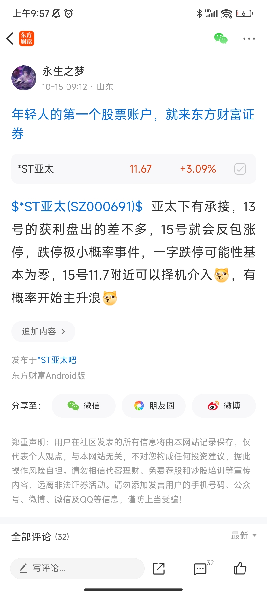 $*ST亚太(SZ000691)$ 亚太自9月30号到现在就做了两笔波段交易,一笔30号入,9号早盘高点出了,另一笔13号地天入的,14号早盘出了,一共满仓赚了8个点,之后一股亚太都没有,关于亚太今天的反包,本人早有预料,并且在今天之前一直坚定看多亚太,并多次提示择机抄底