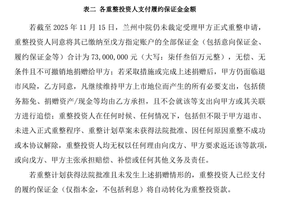 $*ST亚太(SZ000691)$ 兄弟们,我在想一个问题,如果我是如果哈!法院在11月15日后,但在11月25日前正式受理重整,这个时间受理不影响今年完成重整和年报后摘帽。那么根据协议重整投资人是不是先捐赠7300万的保证金的情况下,总计再支付4.03亿投资款,相当于产投成本提高1毛3,财产成本提高1块。大家说有没有可能,兰州市政府完全可以这样操作
