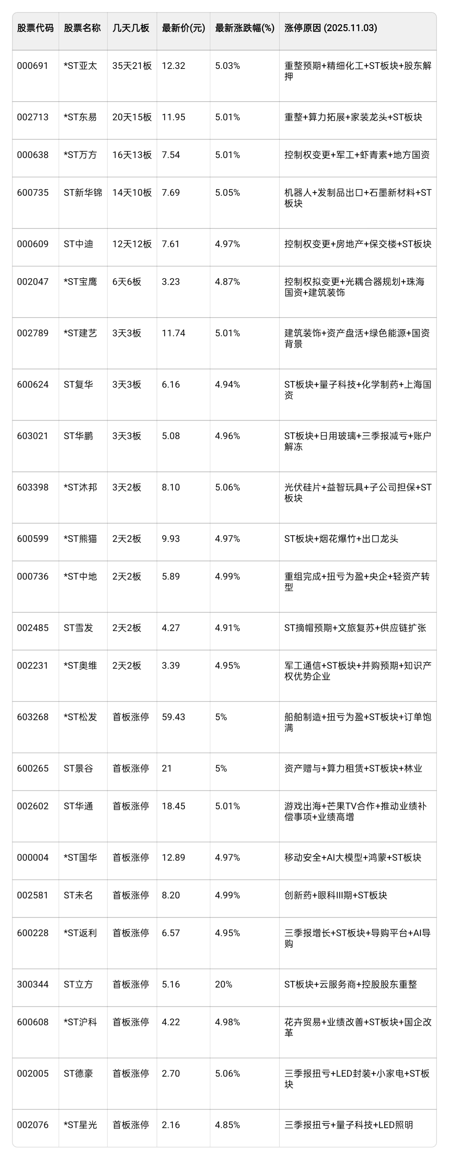 $*ST亚太(SZ000691)$ $*ST东易(SZ002713)$ $*ST万方(SZ000638)$ 11月3日涨停st股一览表