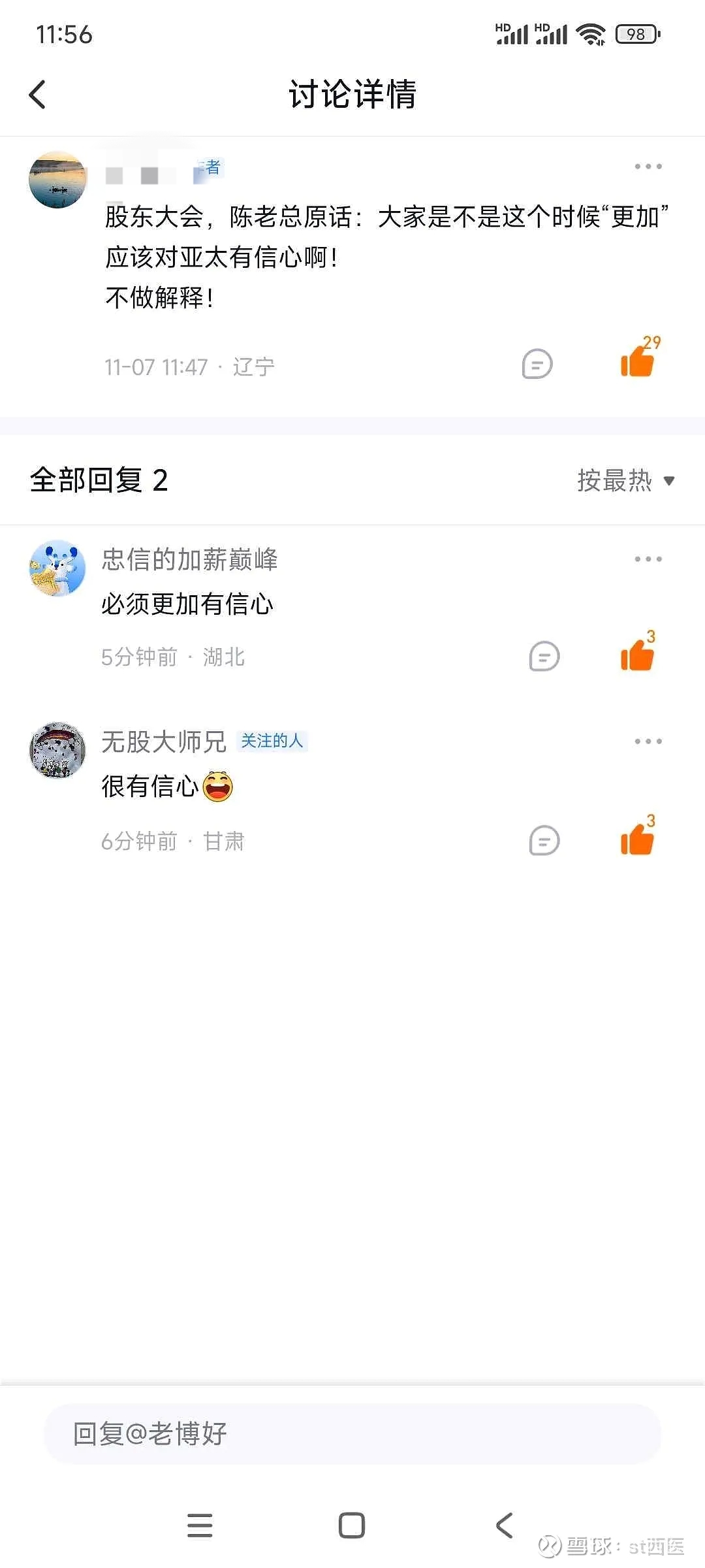 郑重声明:用户在财富号/股吧/博客等社区发表的所有信息(包括但不限于文字、视频、音频、数据及图表)仅代表个人观点,与本网站立场无关,不对您构成任何投资建议,据此操作风险自担。请勿相信代客理财、免费荐股和炒股培训等宣传内容,远离非法证券活动。请勿添加发言用户的手机号码、公众号、微博、微信及QQ等信息,谨防上当受骗!