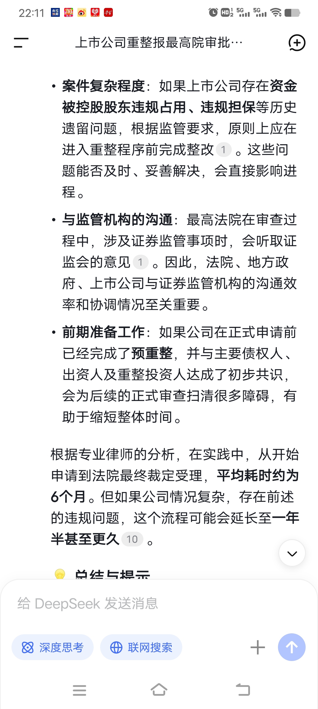上市公司重整 需层报最高人民法院,时间大约半年。