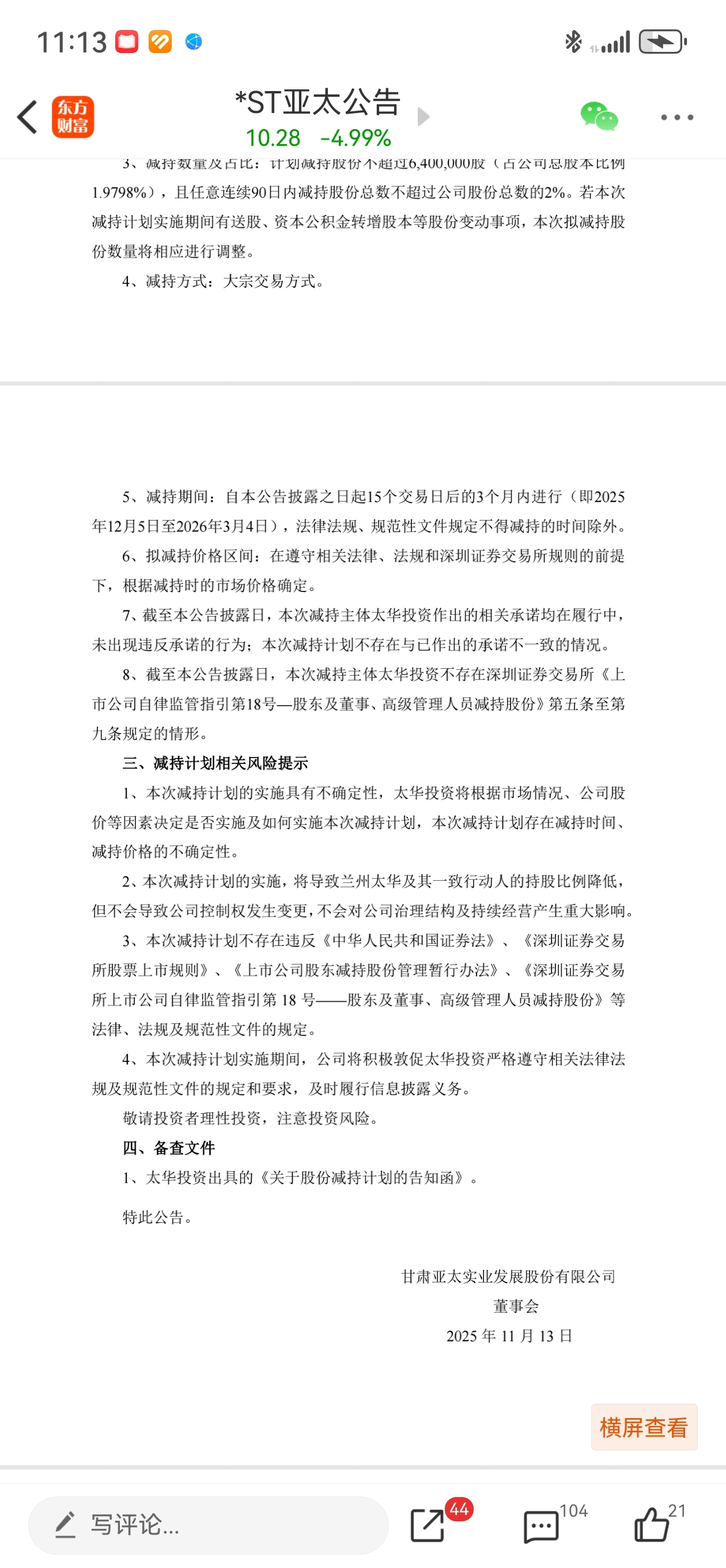 这个公告好啊,没有违反承诺情况下减持,也就是说重整结束后。证明在12月31号之前肯定重组成功,他是12月31号之后减持,也就是重整结束后,而且你看价格是以当时的成交价为主,也就证明当时会到历史峰值。