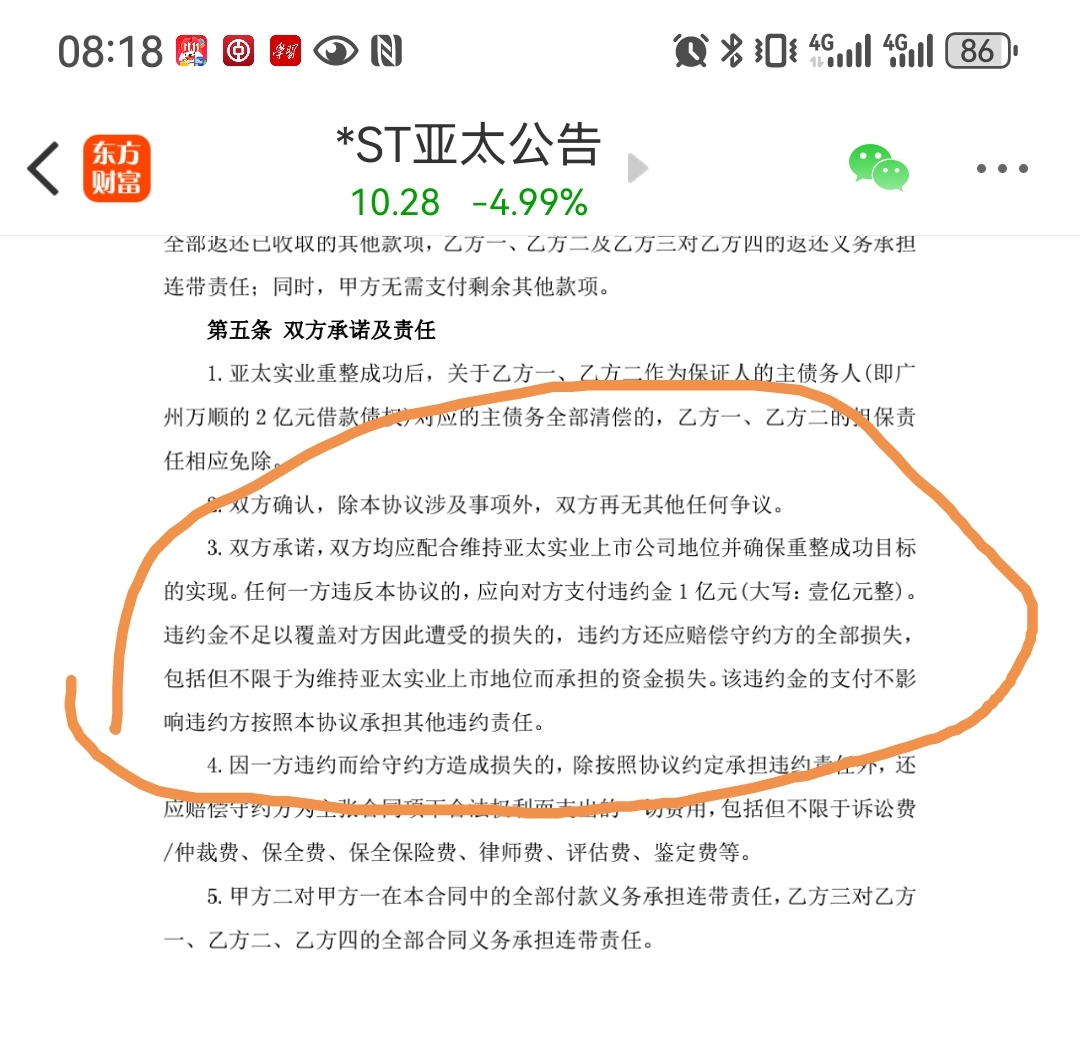 $*ST亚太(SZ000691)$ 明明就是按照合作协议转让股份,违约的话是 1亿元的违约金