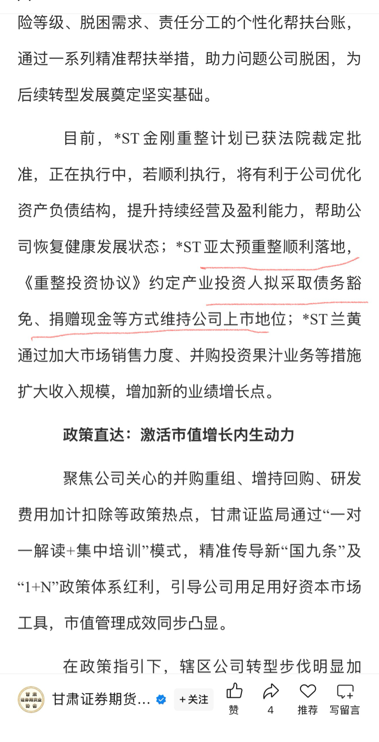 $*ST亚太(SZ000691)$ 10日的发文大家可以再看一下,目前采用是债务豁免和捐赠现金保壳,对比金刚的说法,路条不用想了