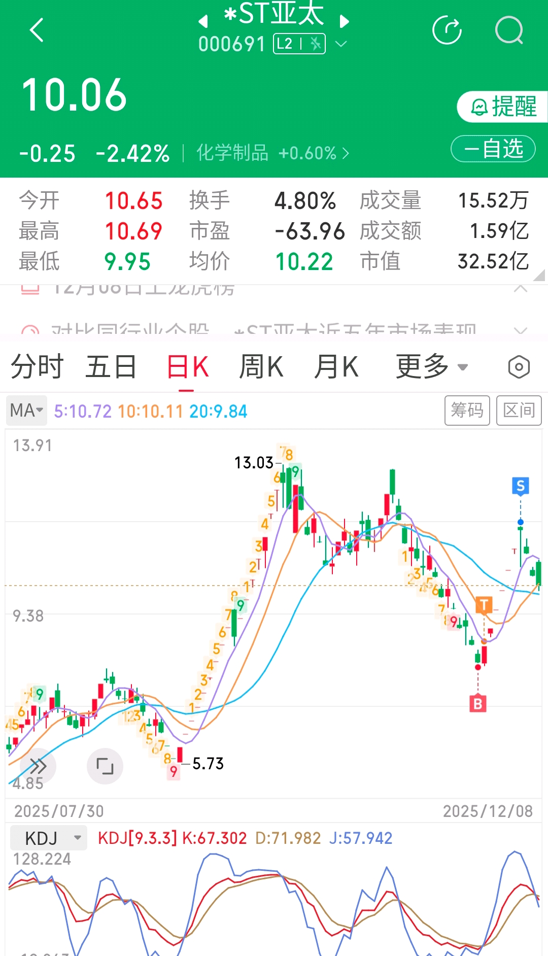 亚太买的不多!赚两万跑了重仓的沐帮,本来赚48%,太贪心吃了五个跌停板!又跑出来了,虽然吃五个板还是盈利的,东易一样的操作,赚50%多逃顶了,下来四个板又抄底,亏回去几个板,现在清仓了所有的st股,到外面做一波再回来
