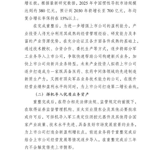 二、转型路径清晰:短期将以精细化工业务为基石,稳固主营规模,年报后实现顺利摘帽;26年起将逐步注入军工业务(已细化:军工类定位测控元器件及其他具备良好前景的……),加快推动公司向新兴领域转型。通过分批、分段资产注入模式(法治社会合规很重要,必须写明三年内不触发借壳上市,实操则会灵活),高效推进业务升级,目标打造兼具新质生产力与顶尖军品技术能力的优质企业。