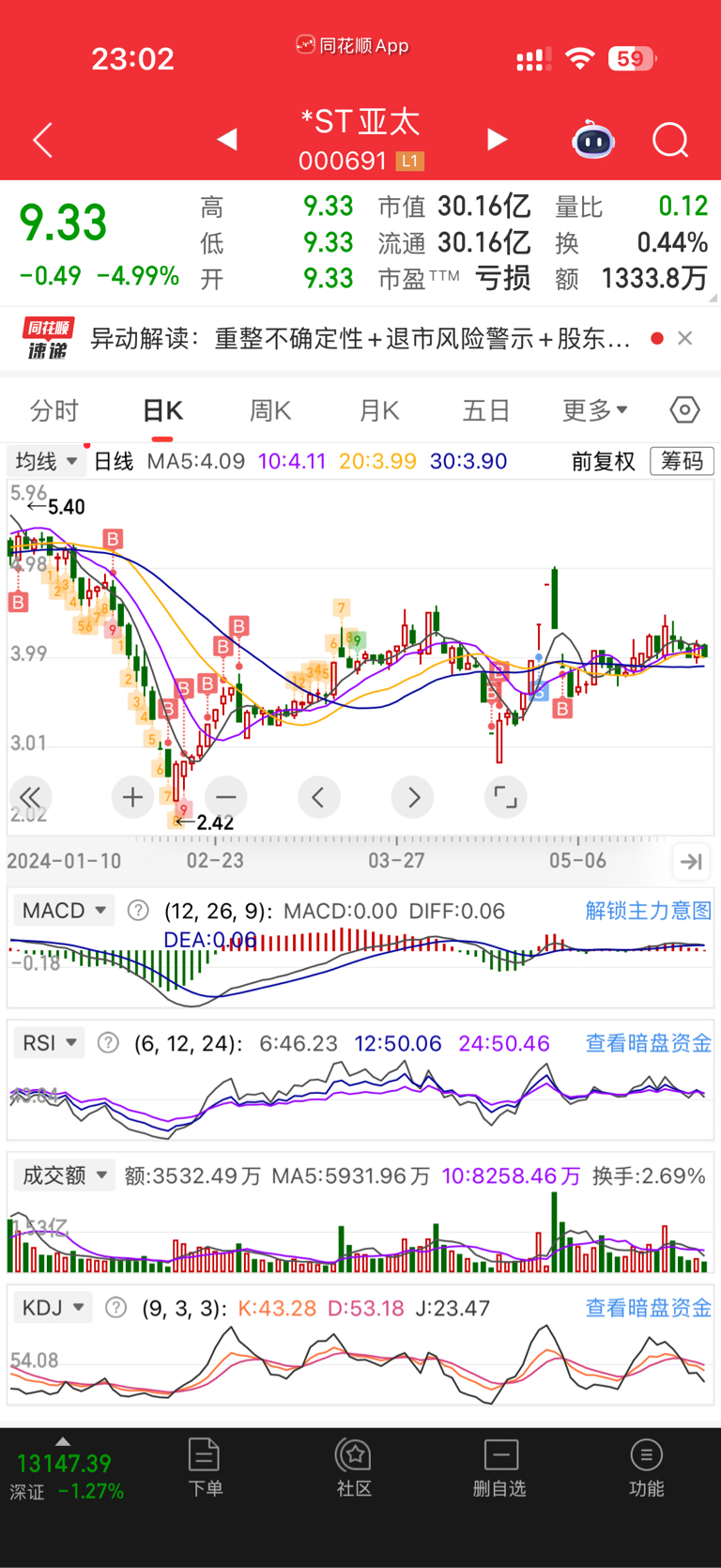 $*ST亚太(SZ000691)$ 其实现在好好想想,也没什么担心的,年初那会儿要戴帽,很可能退市,三元以下买了很多,现在都这个价格了,而且确定性高,还害怕什么呢?现在想想当时真的买的太少!