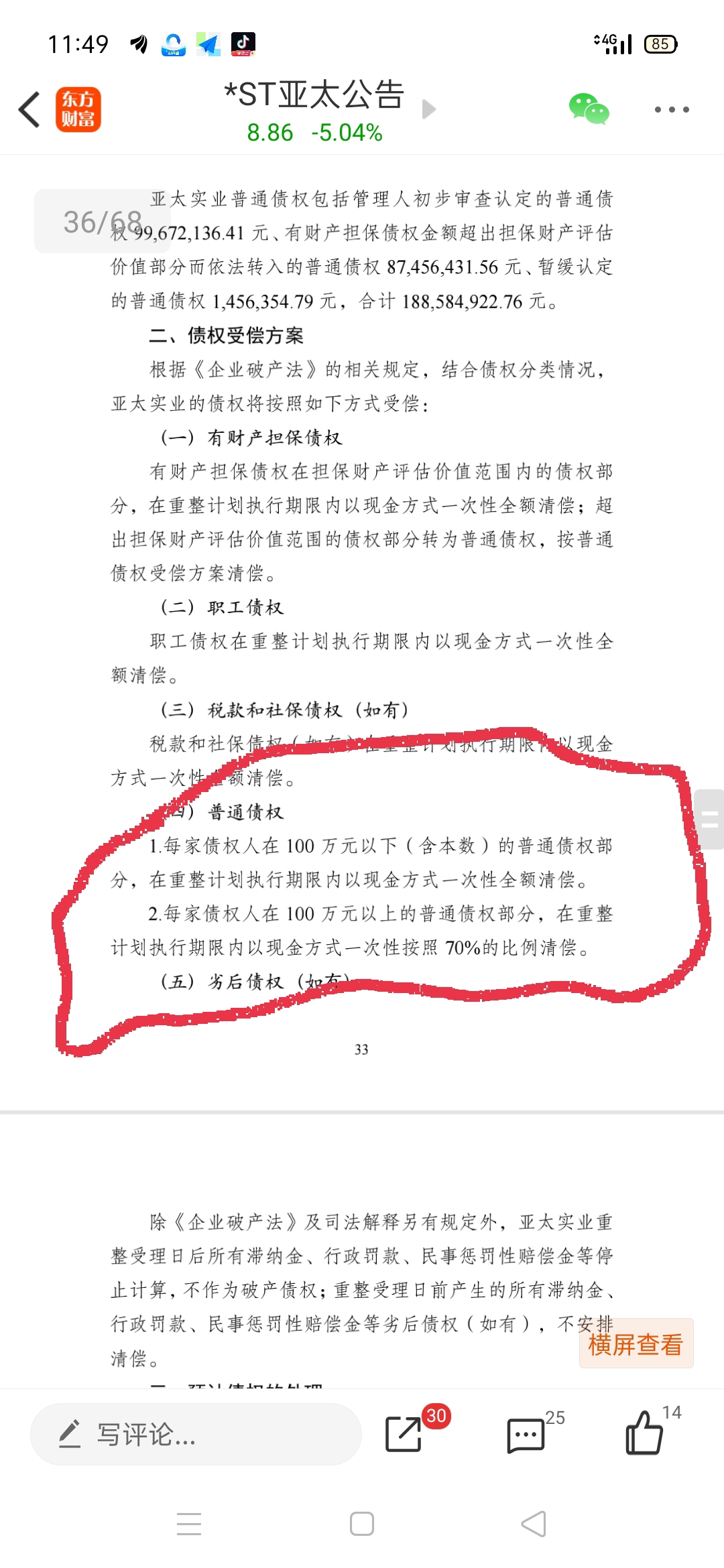 $*ST亚太(SZ000691)$ 好狠,债务在100万元以上的债权人亏大发了!不接受讨价还价!不以股抵债,关于重整,债权人也没有发言权。重整是百分百成功的,只是投资人的成本价最高才2.69元/元,现股价8.86元是最高投资成本价2.69元的三倍多,投资人赚大发了!