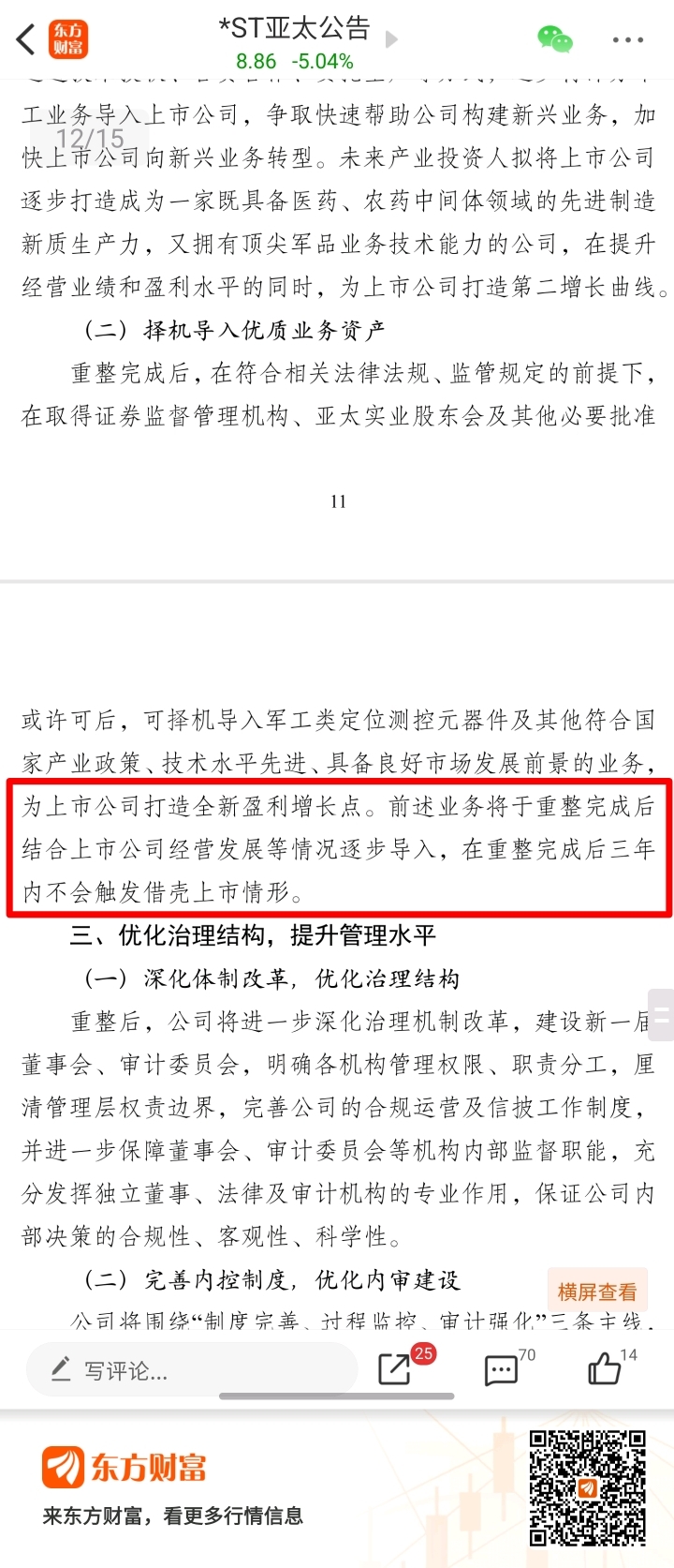$*ST亚太(SZ000691)$ 很多人冲着借壳上市的预期来炒重整,觉得不及预期了走人了。可他从来就没说过借壳上市啊。导入新业务一步一步来,只要三个核心指标导入都不超过100%就不构成借壳上市。我咋感觉这是早就计划好的呢。