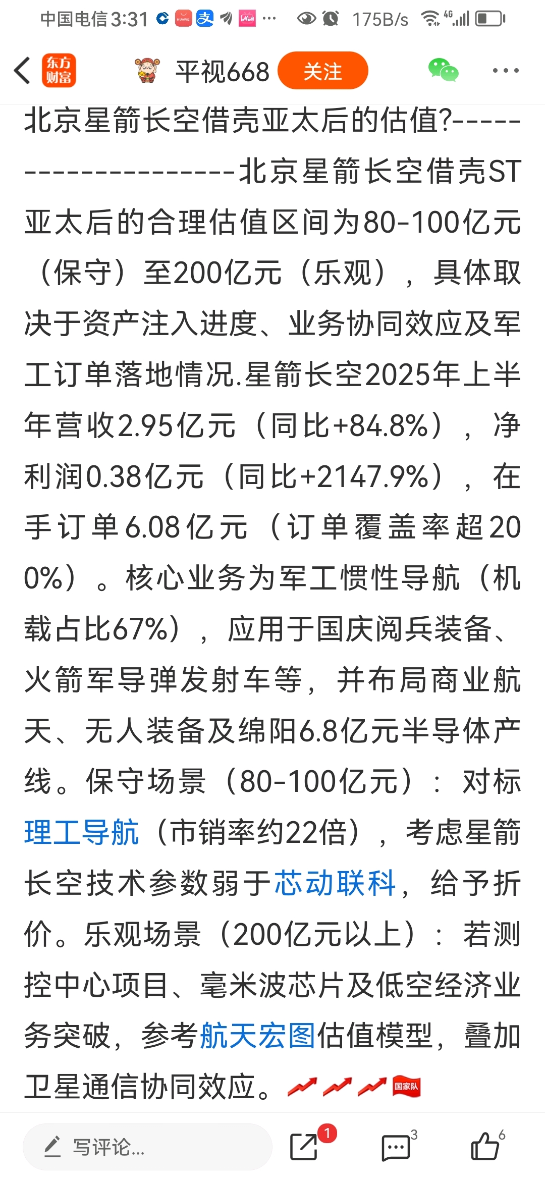 $*ST亚太(SZ000691)$ 星箭长空估值
