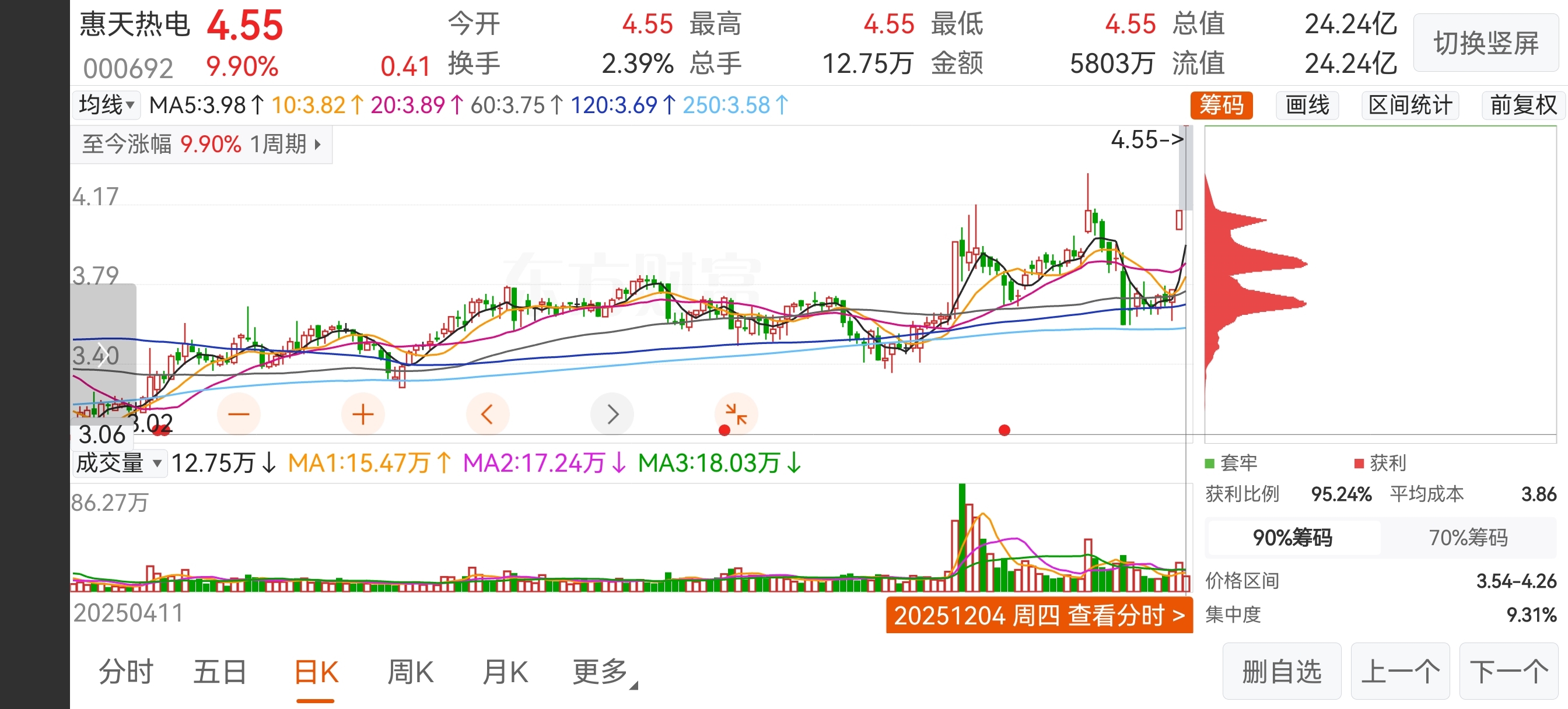$惠天热电(SZ000692)$ 为啥这筹码峰今天变成这样了,都这么短?谁知道咋回事