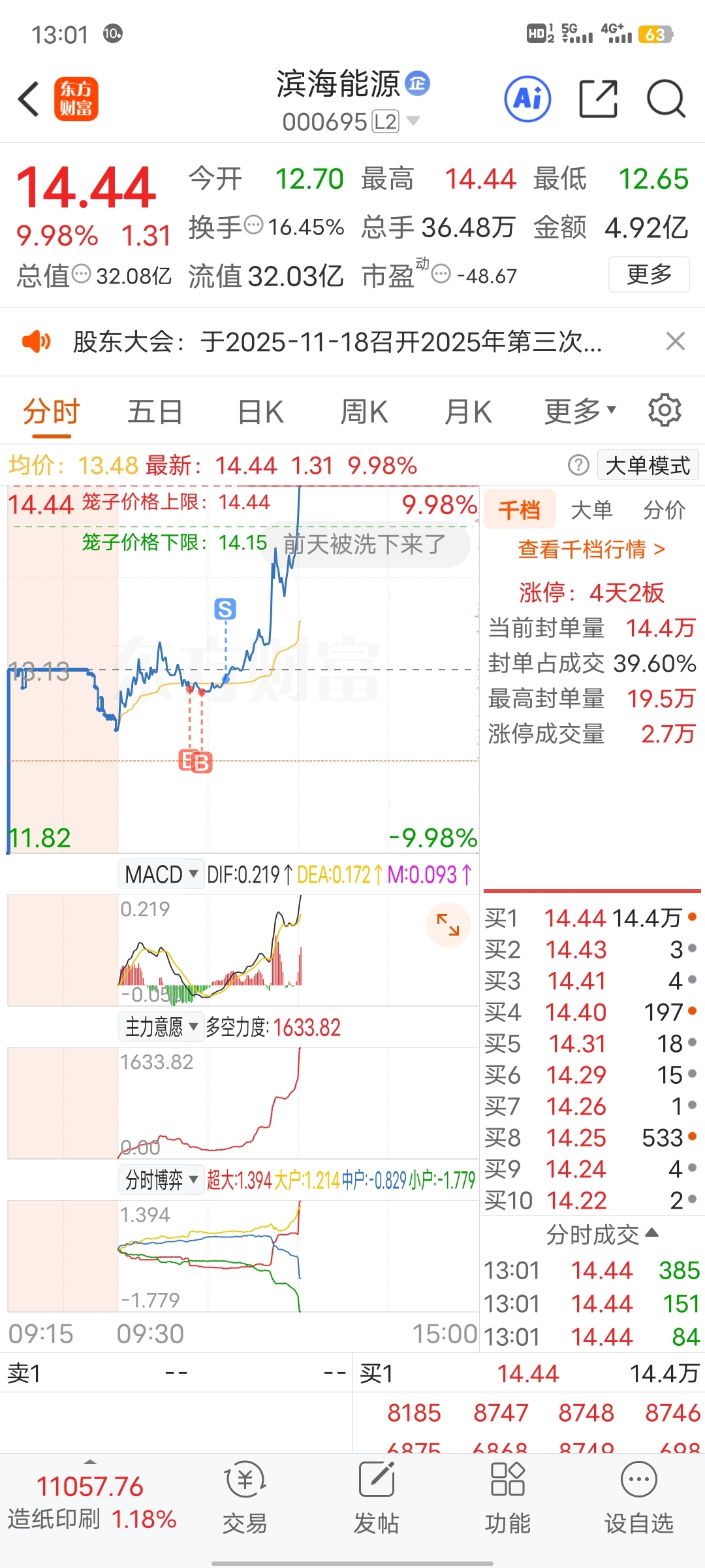 $滨海能源(SZ000695)$ 把大单卖了,做了反T了,少挣好几万啊,后悔死了