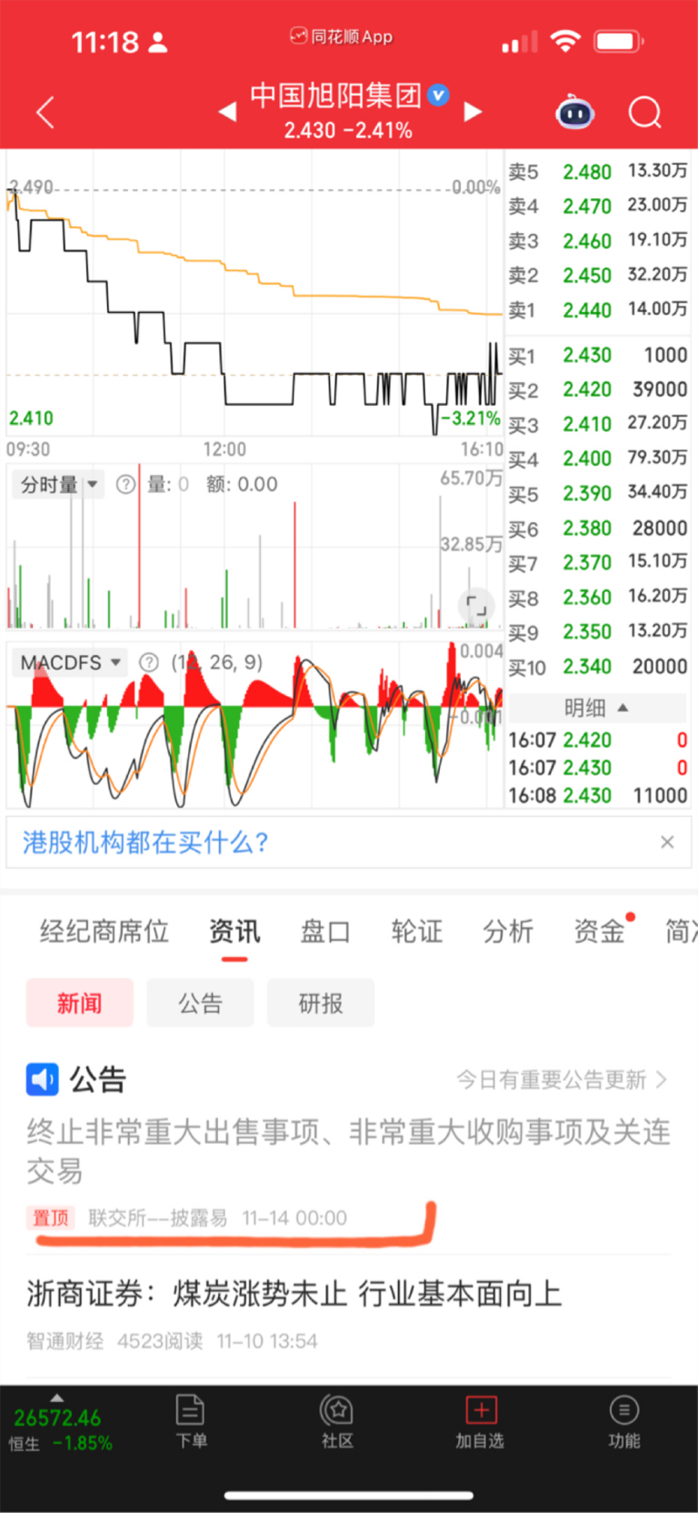$滨海能源(SZ000695)$ 现在大家的分歧很大,但大家没有注意看,港股HK1907中国旭阳集团在昨天11月14日凌晨00:00就已经发布公告了(也就是开盘前就知道消息了),A股是在收盘后发布的。所以,滨海能源昨天开盘低开低走已经反映和消化了利空,之后收盘前拉到红盘,这值得大家深思。(港股HK1907中国旭阳集团,发布公告的时间已经用红线标注)