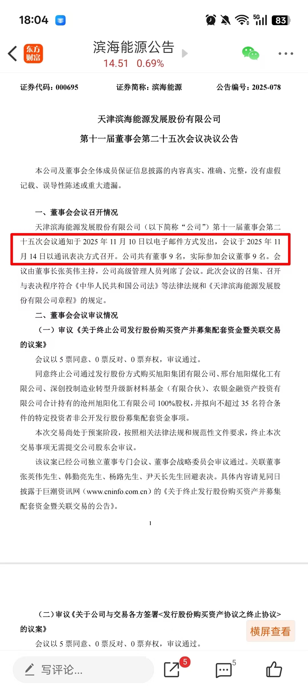 $滨海能源(SZ000695)$ 11月10日通知开会,当天开盘3分钟直线涨停,11月14日表决终止,5天上涨28%,这说明什么?说明终止重组是重大利好,因为沧州旭阳目前是亏损资产是个拖累,放弃收购可以全力发展景气度正回升的锂电池材料。